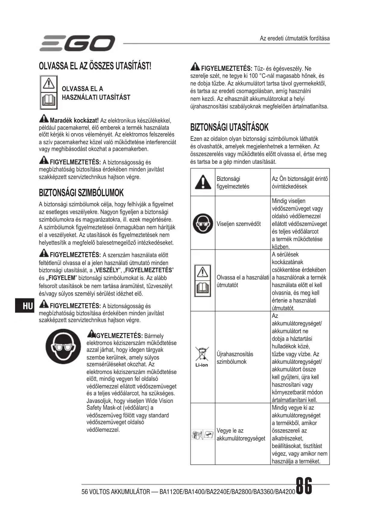 KARBANTARTÁS FIGYELMEZTETÉS: A súlyos személyi sérülések elkerülése érdekében mindig vegye ki az akkumulátoregységet a szerszámból a tartozékok tisztítása, tisztítás vagy karbantartás alatt. FIGYELMEZTETÉS: Javításkor használjon azonos EGO pótalkatrészeket. Más alkatrészek használata veszélyt okozhat, vagy megrongálhatja a terméket. FIGYELMEZTETÉS: Nem javasolt sűrített levegő használata az akkumulátoregység tisztításához. Ha csak sűrített levegővel lehet megtisztítani, akkor mindig viseljen védőszemüveget vagy oldalsó védőlemezzel ellátott védőszemüveget. Ha működtetés közben por keletkezik, akkor viseljen porvédő maszkot is.ÁLTALÁNOS KARBANTARTÁSA műanyag alkatrészek tisztításához ne használjon oldószereket. A legtöbb műanyag a vegyi oldószerek által deformálódás általi sérülésnek van kitéve, ezek megrongálhatják őket. Használjon tiszta ruhát a szennyeződés, por, olaj, zsír stb. eltávolításához. FIGYELMEZTETÉS: Fékolaj, benzin, petróleum alapú termékek, behatoló olajak stb. soha ne érintkezzenek a műanyag alkatrészekkel. A vegyszerek megrongálhatják, gyengíthetik vagy megsemmisíthetik a műanyagot, amely súlyos személyi sérülést okozhat. FIGYELMEZTETÉS: AHHOZ, HOGY CSÖKKENTSE A TŰZVESZÉLY, SZEMÉLYI SÉRÜLÉSEK ÉS A TERMÉK RÖVIDZÁRLAT MIATTI MEGRONGÁLÓDÁS KOCKÁZATÁT, SOHA NE MERÍTSE AZ AKKUMULÁTOREGYSÉGET VAGY A TÖLTŐT FOLYADÉKBA, ÉS NE HAGYJA, HOGY FOLYADÉK KERÜLJÖN BELÉJÜK. A KORRODÁLÓ VAGY KONDUKTÍV FOLYADÉKOK, PL. TENGERVÍZ, SZÁMOS IPARI VEGYSZER ÉS ÓLOM VAGY ÓLOM TARTALMÚ TERMÉKEK STB. RÖVIDZÁRLATOT OKOZHAT.AKKUMULÁTOROKAz akkumulátoregység lítium-ion tölthető akkumulátorokkal van felszerelve. Minden töltés utáni használat időtartama a végzett munka típusától függ. A szerszám akkumulátorai a maximális problémamentes élettartam biztosítására készültek. De mint minden akkumulátor, ezek is elhasználódnak.Ne szerelje szét az akkumulátoregységet, és ne próbálja meg kicserélni az akkumulátorokat. Az akkumulátorok kezelése súlyos égést okozhat, különösen, ha gyűrűt vagy ékszert visel.Az akkumulátor lehető leghosszabb élettartama érdekében olvassa el és értse meg a használati útmutatót. ◾ Amikor nem használja, húzza ki a töltőt, és vegye ki a lítium-ion akkumulátoregységet. A lítium-ion akkumulátoregység 30 napnál hosszabb tárolása:A lítium-ion akkumulátoregységet olyan helyen tárolja, ahol a hőmérséklet 26 °C alatt van, és nedvességtől mentes. ◾ A lítium-ion akkumulátoregységet 30%-50%-ig feltöltött állapotban tárolja. ◾ Tárolás alatt félévente teljesen töltse fel a lítium-ion akkumulátoregységet. ◾ Továbbá tisztítsa meg egy ruhával vagy puha, nem fémes kefével.MEGJEGYZÉS: Az akkumulátoregység fejlett önkarbantartó funkcióval van felszerelve. Egy hónapnál tovább tartó tárolás esetén a töltési kapacitás 30%-át meg tudja tartani. AKKUMULÁTOREGYSÉG ELTÁVOLYTÁSA ÉS ELŐKÉSZÍTÁSE ÚJRAHASZNOSÍTÁSRA Li-ion Ne dobja az akkumulátor töltőt és az akkumulátorokat/újratölthető akkumulátorokat a háztartási hulladékok közé!Az elektromos és elektronikus berendezések hulladékairól szóló 2012/19/EU európai törvény, amely már nincs érvényben, és az 2006/66/EK európai törvény értelmében a sérült vagy elhasznált akkumulátoregységeket/akkumulátorokat környezetbarát módon külön kell gyűjteni és ártalmatlanítani. Kérjen tanácsot a helyi újrahasznosító állomástól a lehetséges újrahasznosítási és/vagy ártalmatlanítási lehetőségekről. FIGYELMEZTETÉS: Ha kiveszi az akkumulátoregységet, hogy újrahasznosításra vagy ártalmatlanításra vigye, akkor fedje be az akkumulátoregységet nagy teherbírású ragasztószalaggal. Ne próbálja meg szétszerelni vagy megsemmisíteni az akkumulátoregységet, vagy levenni bármely komponensét. A lítium-ion akkumulátorokat megfelelően kell újrahasznosítani, vagy ártalmatlanítani. Soha ne érjen a részeihez fém tárgyakkal és/vagy testrészekkel, mivel az rövidzárlatot okozhat. Gyermekektől tartsa távol. Ezen gyelmeztetések be nem tartása tüzet és/vagy súlyos sérülést okozhat.56 VOLTOS AKKUMULÁTOR — BA1120E/BA1400/BA2240E/BA2800/BA3360/BA4200