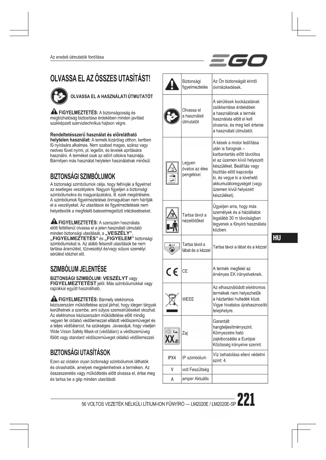 Zaj Garantált hangteljesítményszint. Környezetre ható zajkibocsátás a Európai Közösség irányelve szerint. IPX4 IP szimbólumVíz behatolása elleni védelmi szint: 4. volt Feszültség amper AktuálisAz eredeti útmutatók fordítása56 VOLTOS VEZETÉK NÉLKÜLI LÍTIUM-ION FŰNYÍRÓ — LM2020E / LM2020E-SP222