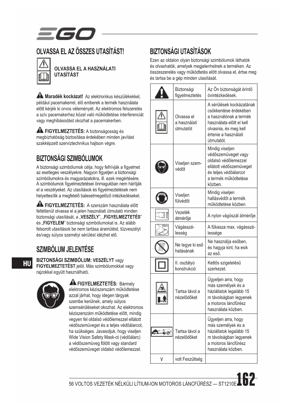 FIGYELMEZTETÉS: Ne hagyja, hogy a termékkel szerzett jártassága miatt óvatlanná váljon. Emlékezzen arra, hogy a másodperc töredéke alatt történő óvatlanság súlyos sérülést okozhat. FIGYELMEZTETÉS: Mindig viseljen oldalsó védőlemezzel ellátott védőszemüveget. Hallásvédővel együtt. Amennyiben nem ezt teszi, tárgyak repülhetnek a szemébe, és más komoly sérülések keletkezhetnek. FIGYELMEZTETÉS: Ne használjon a gyártó által nem javasolt tartozékokat a termékhez. A nem javasolt tartozékok használata súlyos személyes sérülést okozhat. FIGYELMEZTETÉS: A megfelelő vágószállal felszerelt fűkaszát csak fű és hasonló anyagok vágására használja.56 VOLTOS VEZETÉK NÉLKÜLI LÍTIUM-ION MOTOROS LÁNCFŰRÉSZ — ST1210E
