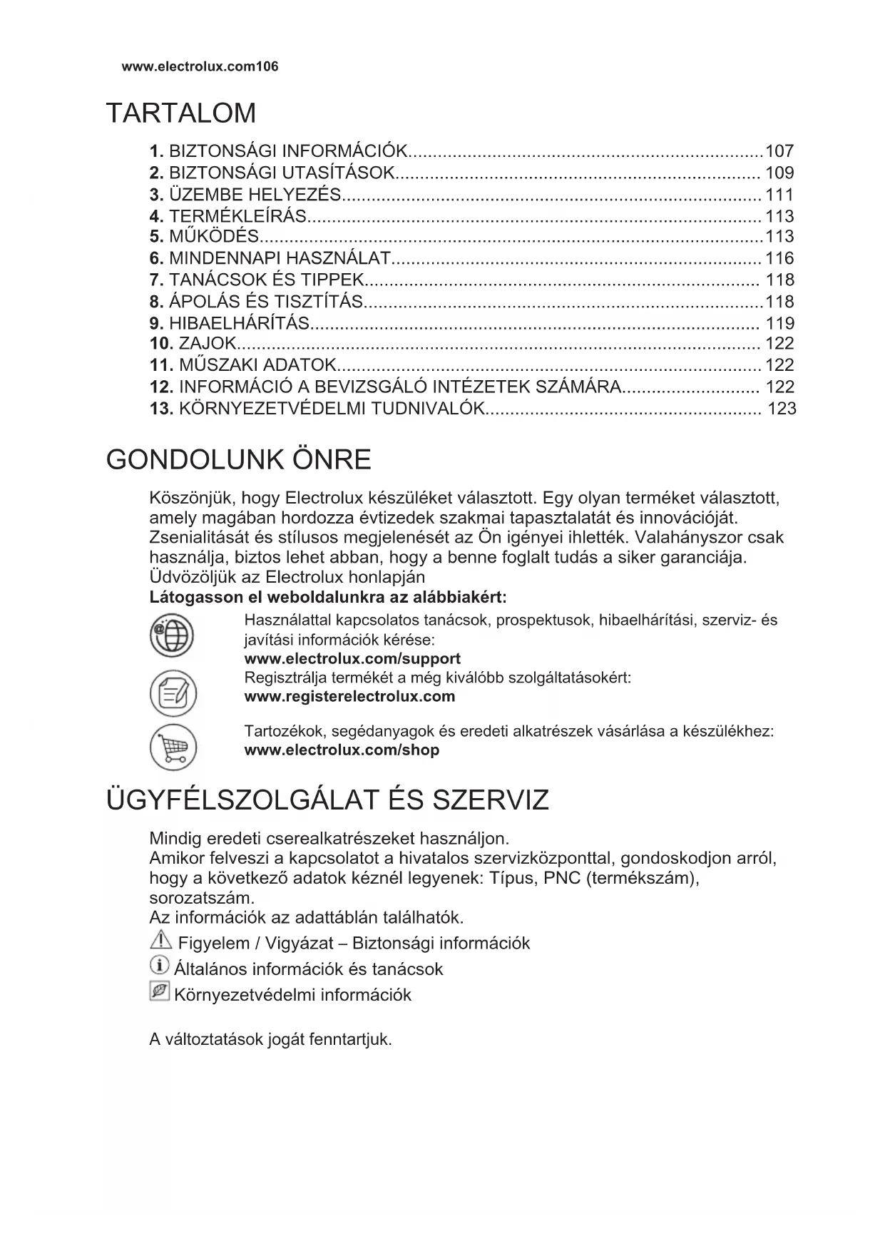 Mindig eredeti cserealkatrészeket használjon. Amikor felveszi a kapcsolatot a hivatalos szervizközponttal, gondoskodjon arról, hogy a következő adatok kéznél legyenek: Típus, PNC (termékszám), sorozatszám. Az információk az adattáblán találhatók. Figyelem / Vigyázat – Biztonsági információk Általános információk és tanácsok Környezetvédelmi információk A változtatások jogát fenntartjuk. www.electrolux.com1061. BIZTONSÁGI INFORMÁCIÓK Az üzembe helyezés és használat előtt gondosan olvassa el a mellékelt útmutatót. A gyártó nem vállal felelősséget a helytelen beszerelés vagy használat miatt keletkezett sérülésekért és károkért. Tartsa biztonságos és elérhető helyen az útmutatót, hogy szükség esetén mindig a rendelkezésére álljon.