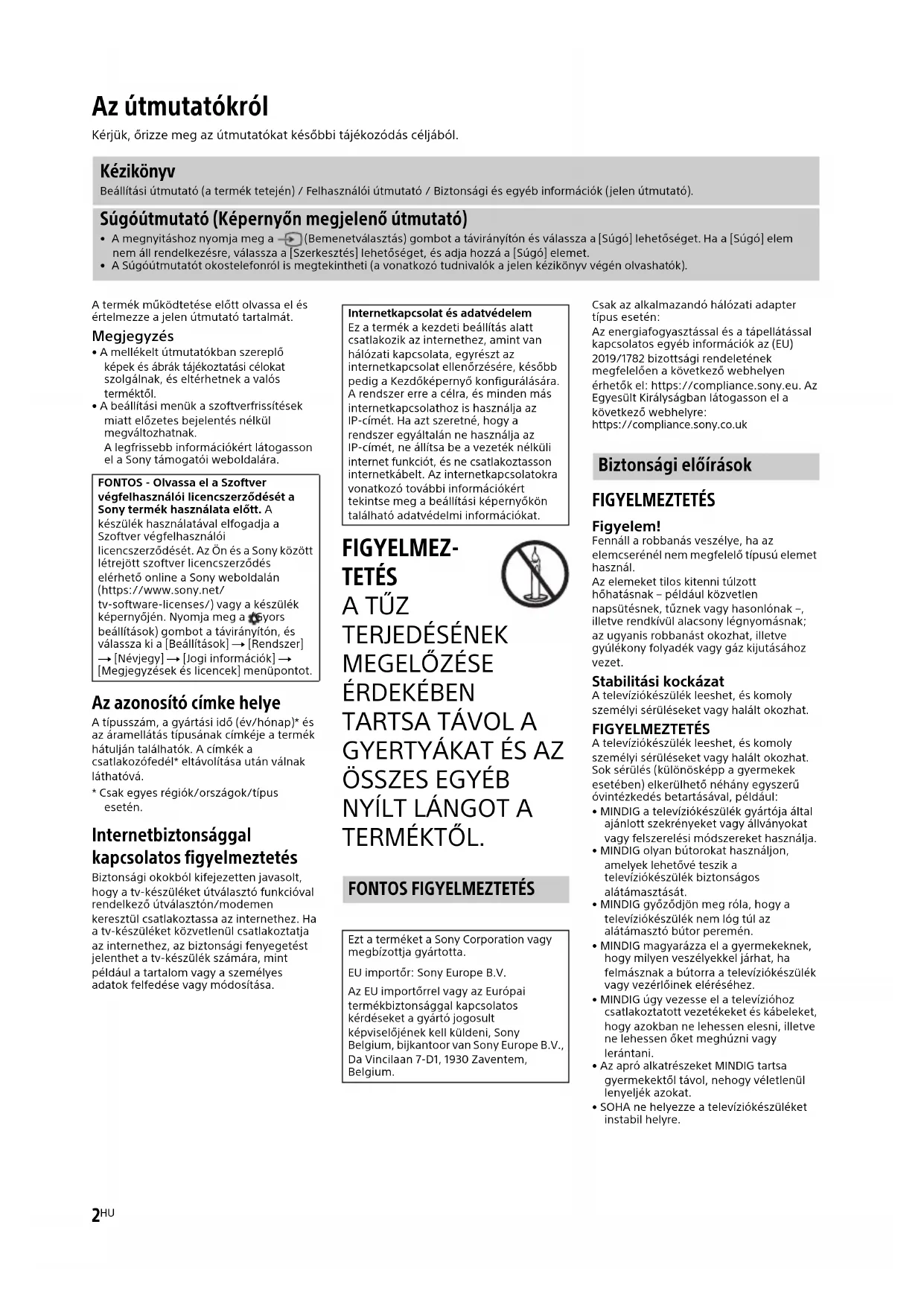 TERMÉKTŐL. Csak az alkalmazandó hálózati adapter típus esetén:Az energiafogyasztással és a tápellátással kapcsolatos egyéb információk az (EU) 2019/1782 bizottsági rendeletének megfelelően a következő webhelyen érhetők el: https://compliance.sony.eu. Az Egyesült Királyságban látogasson el a következő webhelyre: https://compliance.sony.co.uk FIGYELMEZTETÉS Figyelem! Fennáll a robbanás veszélye, ha az elemcserénél nem megfelelő típusú elemet használ.Az elemeket tilos kitenni túlzott hőhatásnak – például közvetlen napsütésnek, tűznek vagy hasonlónak –, illetve rendkívül alacsony légnyomásnak; az ugyanis robbanást okozhat, illetve gyúlékony folyadék vagy gáz kijutásához vezet. Stabilitási kockázat A televíziókészülék leeshet, és komoly személyi sérüléseket vagy halált okozhat. FIGYELMEZTETÉS A televíziókészülék leeshet, és komoly személyi sérüléseket vagy halált okozhat. Sok sérülés (különösképp a gyermekek esetében) elkerülhető néhány egyszerű óvintézkedés betartásával, például:• MINDIG a televíziókészülék gyártója által ajánlott szekrényeket vagy állványokat vagy felszerelési módszereket használja.• MINDIG olyan bútorokat használjon, amelyek lehetővé teszik a televíziókészülék biztonságos alátámasztását.• MINDIG győződjön meg róla, hogy a televíziókészülék nem lóg túl az alátámasztó bútor peremén.• MINDIG magyarázza el a gyermekeknek, hogy milyen veszélyekkel járhat, ha felmásznak a bútorra a televíziókészülék vagy vezérlőinek eléréséhez.• MINDIG úgy vezesse el a televízióhoz csatlakoztatott vezetékeket és kábeleket, hogy azokban ne lehessen elesni, illetve ne lehessen őket meghúzni vagy lerántani.• Az apró alkatrészeket MINDIG tartsa gyermekektől távol, nehogy véletlenül lenyeljék azokat.• SOHA ne helyezze a televíziókészüléket instabil helyre. Az útmutatókról Kérjük, őrizze meg az útmutatókat későbbi tájékozódás céljából. Kézikönyv Beállítási útmutató (a termék tetején) / Felhasználói útmutató / Biztonsági és egyéb információk (jelen útmutató). Súgóútmutató (Képernyőn megjelenő útmutató)