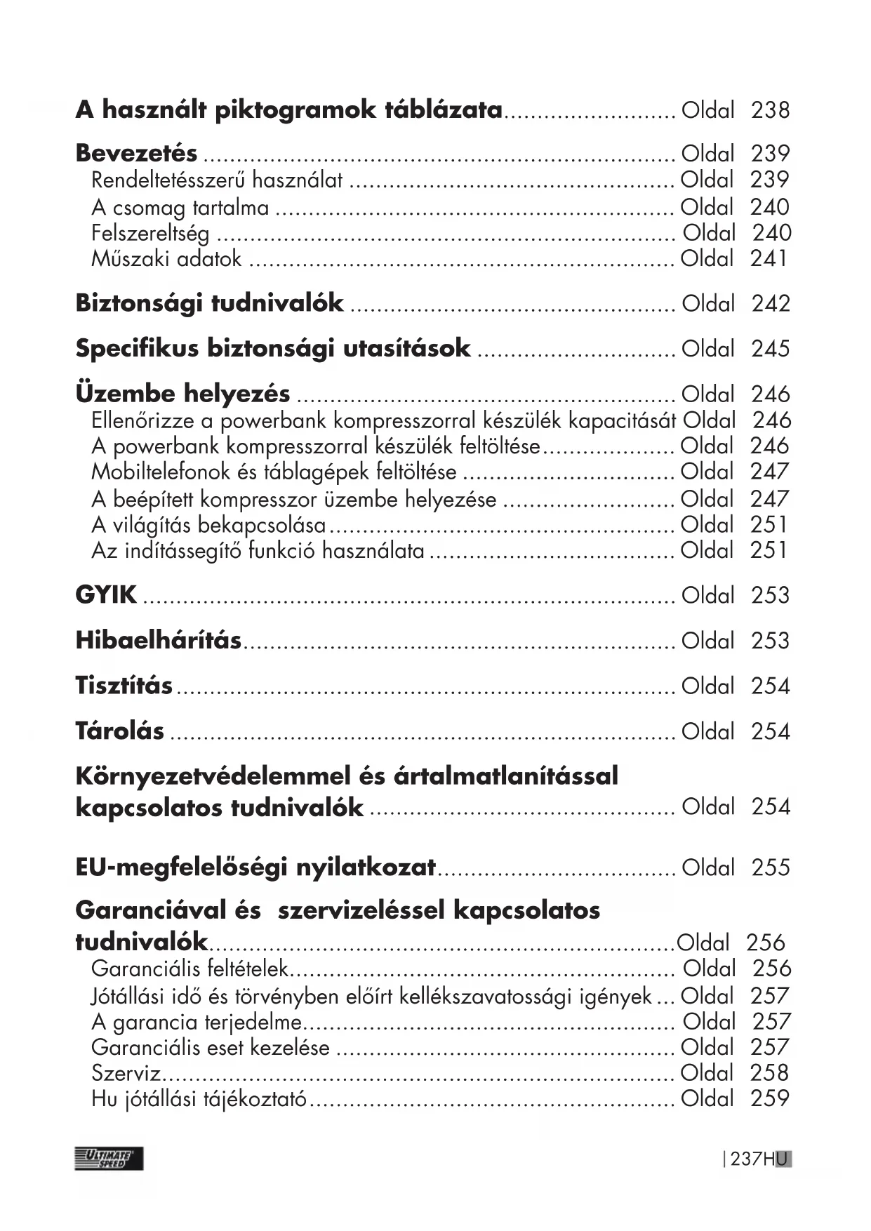 A használt piktogramok táblázata .......................... Oldal 238 Bevezetés ....................................................................... Oldal 239 Rendeltetésszerű használat ................................................. Oldal 239 A csomag tartalma ............................................................ Oldal 240 Felszereltség ..................................................................... Oldal 240 Műszaki adatok ................................................................ Oldal 241 Biztonsági tudnivalók ................................................. Oldal 242 Specifikus biztonsági utasítások .............................. Oldal 245 Üzembe helyezés ......................................................... Oldal 246 Ellenőrizze a powerbank kompresszorral készülék kapacitását Oldal 246 A powerbank kompresszorral készülék feltöltése .................... Oldal 246 Mobiltelefonok és táblagépek feltöltése ................................ Oldal 247 A beépített kompresszor üzembe helyezése .......................... Oldal 247 A világítás bekapcsolása .................................................... Oldal 251 Az indítássegítő funkció használata ..................................... Oldal 251 GYIK ................................................................................ Oldal 253 Hibaelhárítás ................................................................. Oldal 253 Tisztítás ........................................................................... Oldal 254 Tárolás ............................................................................ Oldal 254 Környezetvédelemmel és ártalmatlanítással kapcsolatos tudnivalók .............................................. Oldal 254 EU-megfelelőségi nyilatkozat .................................... Oldal 255 Garanciával és szervizeléssel kapcsolatos tudnivalók ...................................................................... Oldal 256 Garanciális feltételek.......................................................... Oldal 256 Jótállási idő és törvényben előírt kellékszavatossági igények ... Oldal 257 A garancia terjedelme........................................................ Oldal 257 Garanciális eset kezelése ................................................... Oldal 257 Szerviz ............................................................................. Oldal 258 Hu jótállási tájékoztató ....................................................... Oldal 259238 HU A használt piktogramok táblázata Olvassa el a használati útmutatót! Használjon hallásvédő eszközt! A töltőkészülék csak beltéri használatra alkalmas. Figyelmeztetés áramütésre! Életveszély! Tartsa be a figyelmez- tetéseket és biztonsági utasításokat! Vigyázat! Robbanásveszély! A LED-lámpa nem alkalmas helyiségek megvilágítására háztartásokban. Nyersanyagok vissza- nyerése a hulladékok ártalmatlanítása helyett! -21°C A LED-lámpa -21°C-ig terjedő, szélsőséges hőmérsékletek esetén is használható. Környezetbarát módon ártalmatlanítsa a csoma- golást és a készüléket! Érintésvédelmi osztály III IP20 Védettségi osztály Fontos tudnivaló USB aljzat polaritása Figyelmeztetés: A kompresszorberen- dezés figyelmeztetés nélkül beindulhat. Az akkumulátort környezetvédelmi szem- pontból megfelelően ártalmatlanítsa! Egyenáram Érintésvédelmi osztály II Újrahasznosítható anyagokból készült Figyelem! Forró felület! 50/60 Hz 50/60 Hz frekvencia