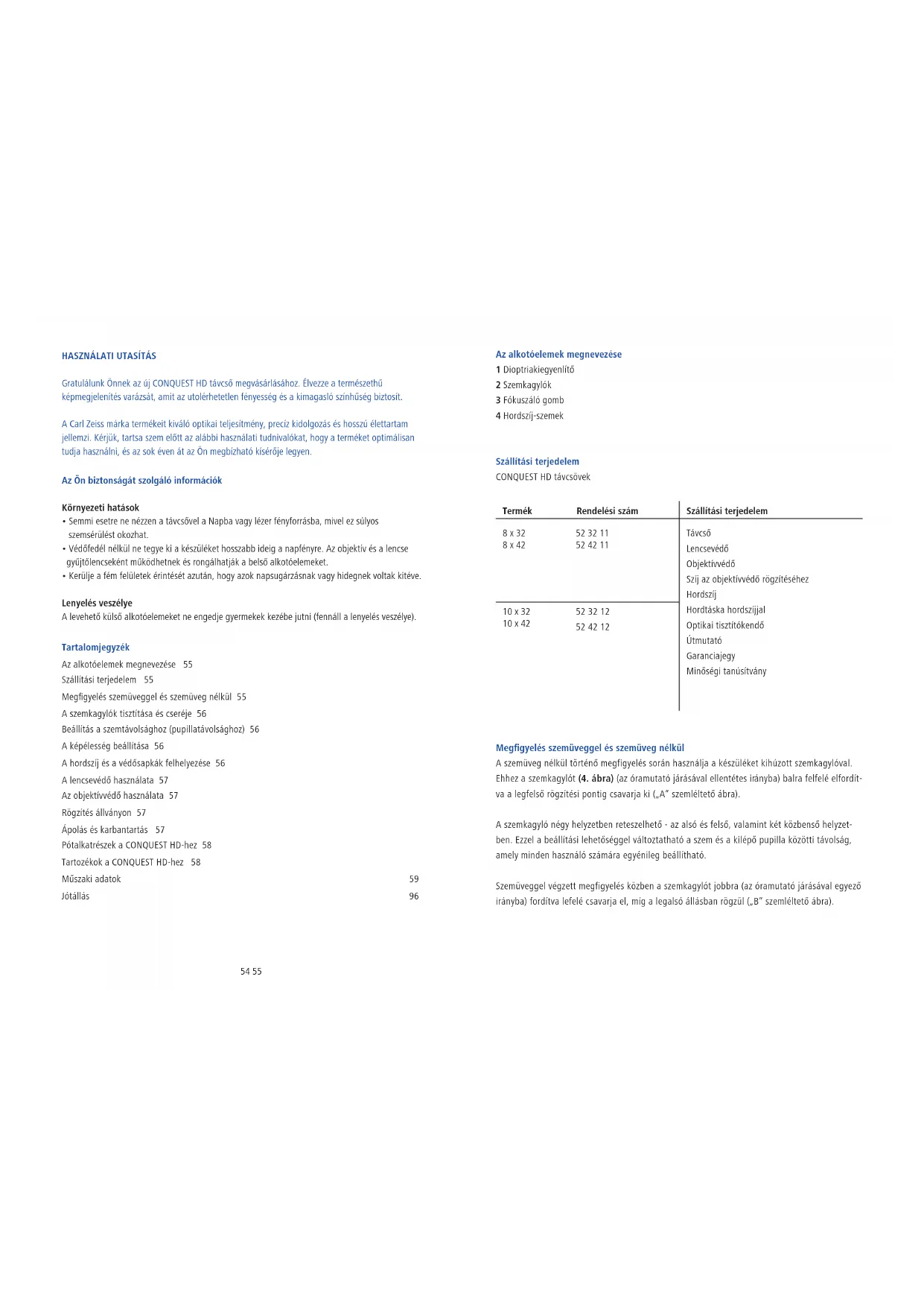 A Carl Zeiss marka termekit kivalo optikai teljesitmemy, preciz kidolgozás éhoszü elettartam jellemzi. Kérjuk, tartsa szem elott az alabbi hasznalati tudnivalokat, hogy a termeket optimisitan tudja használni, és az suk even át az On megbizható kiseröje legyen.