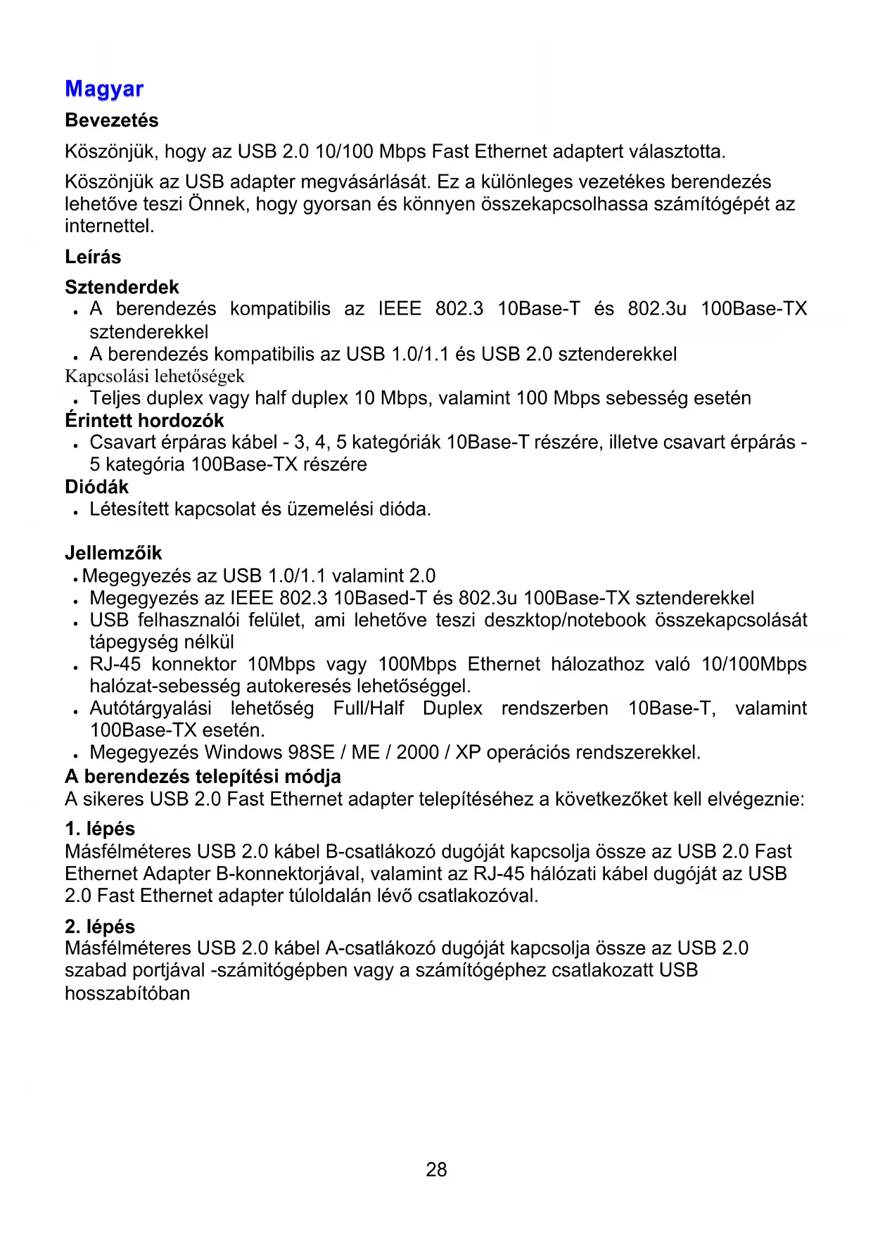 Bevezetés Köszönjük, hogy az USB 2.0 10/100 Mbps Fast Ethernet adaptert választotta. Köszönjük az USB adapter megvásárlását. Ez a különleges vezetékes berendezés lehetőve teszi Önnek, hogy gyorsan és könnyen összekapcsolhassa számítógépét az internettel. Leírás Sztenderdek z A berendezés kompatibilis az IEEE 802.3 10Base-T és 802.3u 100Base-TX sztenderekkel z A berendezés kompatibilis az USB 1.0/1.1 és USB 2.0 sztenderekkel Kapcsolási lehetőségek z Teljes duplex vagy half duplex 10 Mbps, valamint 100 Mbps sebesség esetén Érintett hordozók z Csavart érpáras kábel - 3, 4, 5 kategóriák 10Base-T részére, illetve csavart érpárás - 5 kategória 100Base-TX részére Diódák z Létesített kapcsolat és üzemelési dióda. Jellemzőik z Megegyezés az USB 1.0/1.1 valamint 2.0 z Megegyezés az IEEE 802.3 10Based-T és 802.3u 100Base-TX sztenderekkel z USB felhasznalói felület, ami lehetőve teszi deszktop/notebook összekapcsolását tápegység nélkül z RJ-45 konnektor 10Mbps vagy 100Mbps Ethernet hálozathoz való 10/100Mbps halózat-sebesség autokeresés lehetőséggel. z Autótárgyalási lehetőség Full/Half Duplex rendszerben 10Base-T, valamint 100Base-TX esetén. z Megegyezés Windows 98SE / ME / 2000 / XP operációs rendszerekkel. A berendezés telepítési módja A sikeres USB 2.0 Fast Ethernet adapter telepítéséhez a következőket kell elvégeznie: