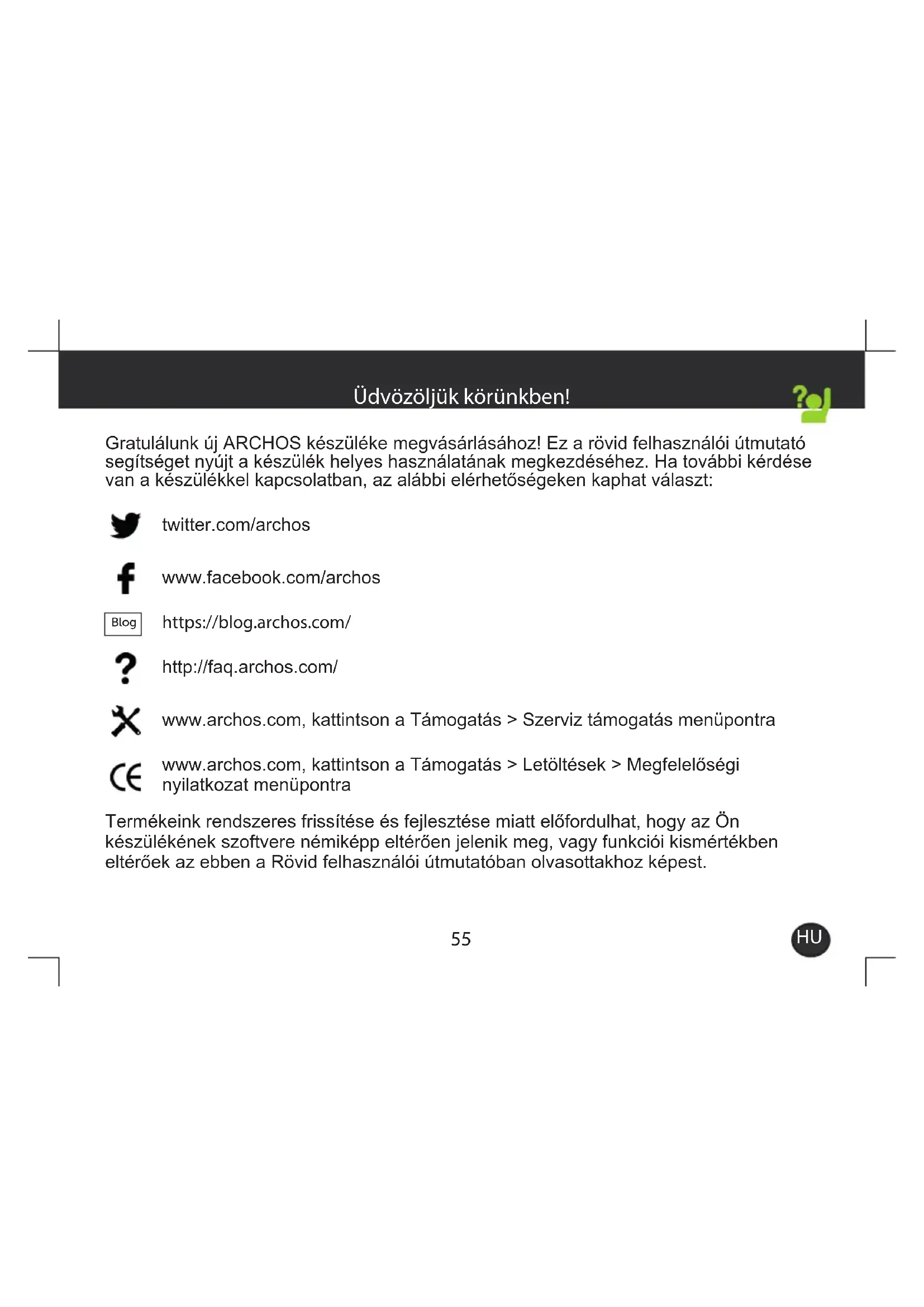 Gratulálunk új ARCHOS készüléke megvásárlásához! Ez a rövid felhasználói útmutató segítséget nyújt a készülék helyes használatának megkezdéséhez. Ha további kérdése van a készülékkel kapcsolatban, az alábbi elérhetőségeken kaphat választ: twitter.com/archos www.facebook.com/archos Blog https://blog.archos.com/ http://faq.archos.com/ www.archos.com, kattintson a Támogatás > Szerviz támogatás menüpontra www.archos.com, kattintson a Támogatás > Letöltések > Megfelelőségi nyilatkozat menüpontra Termékeink rendszeres frissítése és fejlesztése miatt előfordulhat, hogy az Ön készülékének szoftvere némiképp eltérően jelenik meg, vagy funkciói kismértékben eltérőek az ebben a Rövid felhasználói útmutatóban olvasottakhoz képest. Üdvözöljük körünkben!70C Neon 19-12-2016last modification:ARCHOS 70c NeonCONFIDENTIAL CMFRev scale 1:1mm Silk Screening (丝印颜色): White AC70CNE