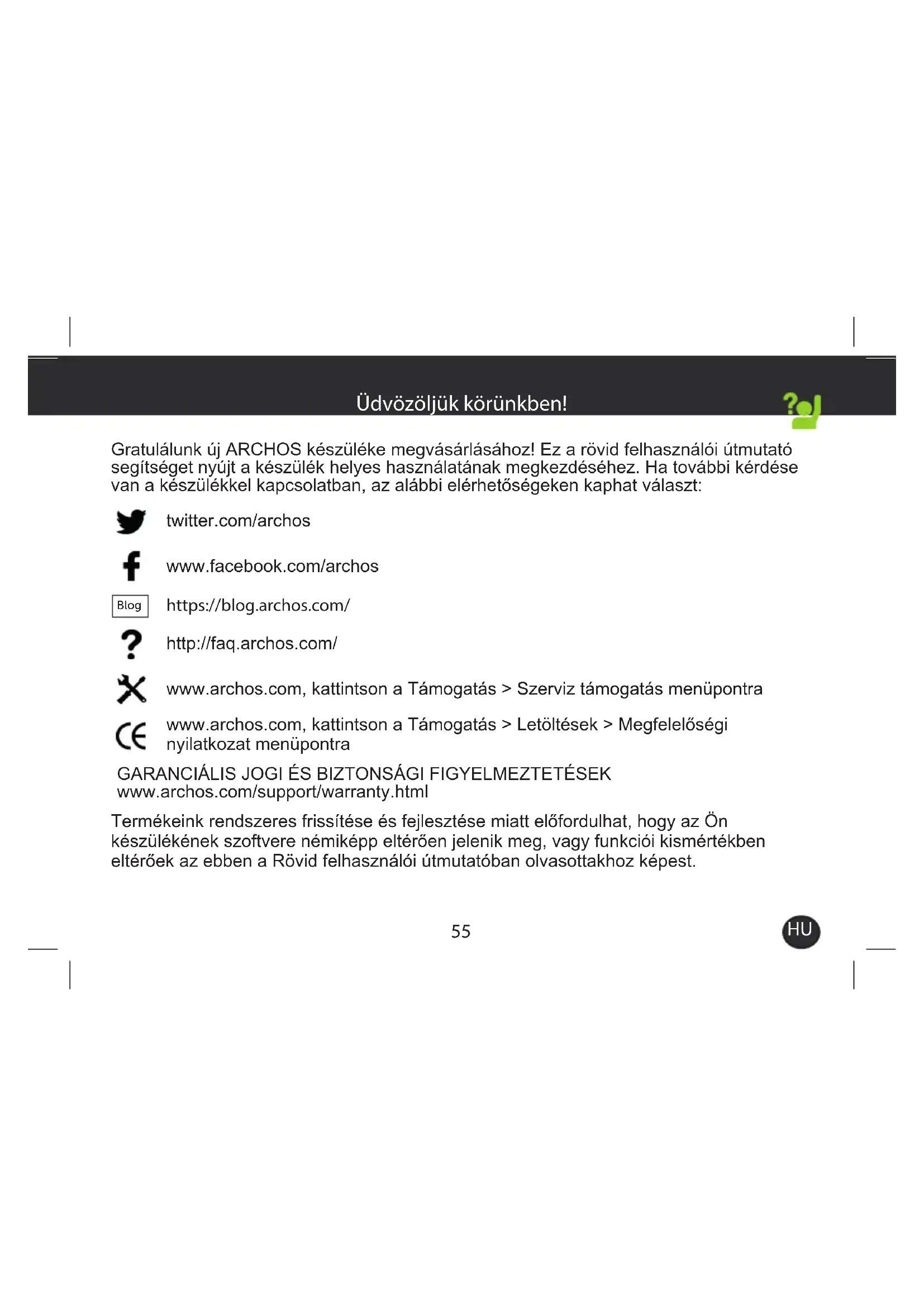 Gratulalunk uy ARCHOS keszüléke megvasárlásáho! Ez a rovid felhasználoi utmutató segítseget nyújt a keszülék helyes használatának megkezdéséhez. Ha további kerdese van a keszülékkel capcsolatban, az alábbi elerhetósegeken kaphat valaszt: