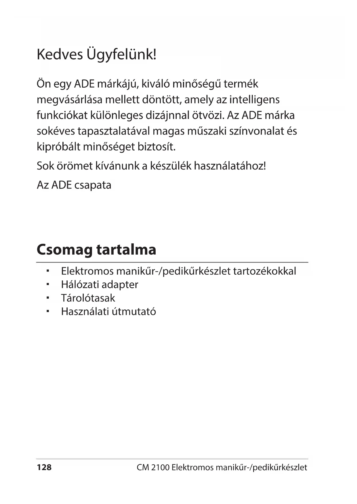 - Výstupní napětí: 30V Výstupní proud: 0,25A Výstupní výkon: 7,5W Průměrná aktivní účinnost: 80,26% Účinnost při nízkém zatížení: (25%): 78,71% Spotřeba energie při nulovém zatížení: ≤ 0,1W Distributor: Waagen-Schmitt GmbH Hammer Steindamm 27-29 22089 Hamburk, Německo126 Elektrická souprava pro manikúru/pedikúru CM 2100 Naše výrobky jsou neustále vyvíjeny a vylepšovány. Z tohoto důvodu jsou kdykoli možné designové a technické změny. Záruka Vážený zákazníku, Společnost Waagen-Schmitt GmbH zaručuje po dobu 2 let ode dne nákupu bezplatné odstranění závad v důsledku materiálových nebo výrobních vad, a to opravou nebo výměnou. V případě nároku na uplatnění záruky prosím vraťte produkt prodejci spolu s dokladem o koupi (a s uvedením důvodu reklamace). Prohlášení o shodě Společnost Waagen-Schmitt GmbH tímto prohlašuje, že souprava pro manikúru apedikúru odpovídá směrnicím 2014/30/EU, 2014/35/EU a2011/65/EU. Prohlášení ztrácí svoji platnost, pokud bude na přístroji provedena změna, která snámi nebyla dohodnuta. Hamburk, leden 2021 Waagen-Schmitt GmbH127 Elektrická souprava pro manikúru/pedikúru CM 2100 Čeština Likvidace Likvidace obalu Obal odevzdejte do tříděného odpadu. Lepenku a karton odevzdejte do starého papíru, fólie do sběrny recyklovatelných surovin. Likvidace výrobku Výrobek zlikvidujte podle předpisů platných ve vaší zemi. Přístroje nesmí být likvidovány s běžným domovním odpadem Po skončení životnosti musí být výrobek řádně zlikvidován. Při správné likvidaci jsou suroviny obsažené ve výrobku recyklovány a nedochází tak k zatížení životního prostředí. Vraťte starý přístroj do sběrného místa pro elektronický odpad nebo sběrného dvora. Další informace získáte od místní společnosti pro nakládání s odpady nebo místní správy.128 CM 2100 Elektromos manikűr-/pedikűrkészlet Kedves Ügyfelünk! Ön egy ADE márkájú, kiváló minőségű termék megvásárlása mellett döntött, amely az intelligens funkciókat különleges dizájnnal ötvözi. Az ADE márka sokéves tapasztalatával magas műszaki színvonalat és kipróbált minőséget biztosít. Sok örömet kívánunk a készülék használatához! Az ADE csapata Csomag tartalma Elektromos manikűr-/pedikűrkészlet tartozékokkal Hálózati adapter Tárolótasak Használati útmutató129 CM 2100 Elektromos manikűr-/pedikűrkészlet Magyar Tartalom Csomag tartalma p. 128