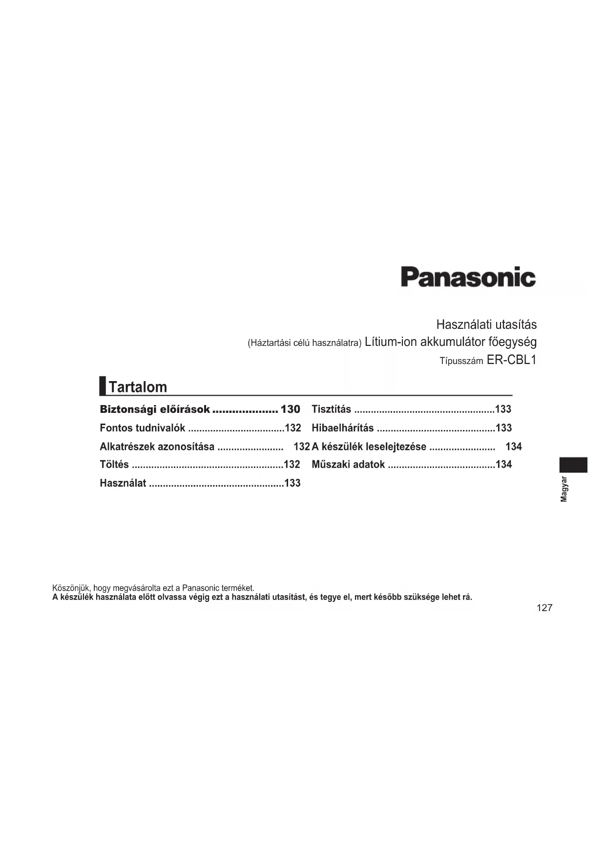 - A jelen készüléket kizárólag háztartási használatra tervezték. A termék enerigahatékonyságával kapcsolatos további információkhoz keresse fel webhelyünket, www.panasonic.com, és írja be ott a típusszámot a keresőablakba. Tájékoztatásfelhasználókszámáraazelhasználódott készülékek,szárazelemekésakkumulátorokbegyűjtésérőlés ártalmatlanításáról Csak azEurópaiUnióésolyanországokrészére,amelyek begyűjtőrendszerekkelrendelkeznek A termékeken, a csomagoláson és/vagy a kísérő dokumentumokon szereplő szimbólumok azt jelentik, hogy az elhasználódott elektromos és elektronikus termékeket, szárazelemeket és akkumulátorokat tilos az általános háztartási hulladékkal keverni. Az elhasználódott készülékek, szárazelemek és akkumulátorok megfelelő kezelése, hasznosítása és újrafelhasználása céljából, kérjük, hogy a helyi törvényeknek, megfelelően juttassa el azokat a kijelölt gyűjtőhelyekre. E termékek, szárazelemek és akkumulátorok előírásszerű ártalmatlanításával Ön hozzájárul az értékes erőforrások megóvásához, és megakadályozza az emberi egészség és a környezet károsodását. Amennyiben a begyűjtéssel és újrafelhasználással kapcsolatban további kérdése lenne, kérjük, érdeklődjön a helyi önkormányzatnál. E hulladékok szabálytalan elhelyezését a nemzeti jogszabályok büntethetik.135 Magyar Megjegyzésaszárazelem-ésakkumulátor- szimbólummalkapcsolatban(alsószimbólumpélda) Ezek a szimbólumok kémiai szimbólummal együtt alkalmazhatók. Ebben az esetben teljesíti az EU irányelvnek vegyi anyagra vonatkozó követelményét. Műszaki adatok: Minőségtanúsítás Motorfeszültség: 3,6 V egyenfeszültség Töltési idő: 1 óra Ezt a készüléket kizárólag háztartási használatra tervezték. Tápellátás: beépített akkumulátor Tápfeszültség: 1,2 V egyenfeszültség Méretek (szélesség x magasság x mélység): 3,3 cm 12,8 cm 3,2 cm Tömeg: 120 g Hálózati tápegység és akkumulátor töltő adatai: Típus: RE7-87 Hálózati feszültség: 100 – 240 V , 50 – 60 Hz Áramfelvétel: 180 mA Kimenő feszültség: 4,8 V egyenfeszültség Terhelhetőség: 1,25 A Áramfogyasztás: 6,0 W Érintésvédelmi osztály: II. Méretek (szélesség x magasság x mélység): 4,8 cm 2,4 cm 10,2 cm Tömeg: 130 g Megjegyzés: A műszaki adatok változtatásának jogát fenntartjuk. A tömeg- és méretadatok megközelítő értékek.136 Română Instrucţiuni de utilizare (Utilizare casnică) Unitate principală cu acumulator Li-Ion Nr. model ER-CBL1 Vă mulţumim că aţi achiziţionat acest produs Panasonic. Înaintedeautilizaacestdispozitiv,vărugămsăcitiţitoateacesteinstrucţiunişisălepăstraţipentrureferinţeulterioare. Precauții de siguranță p. 140