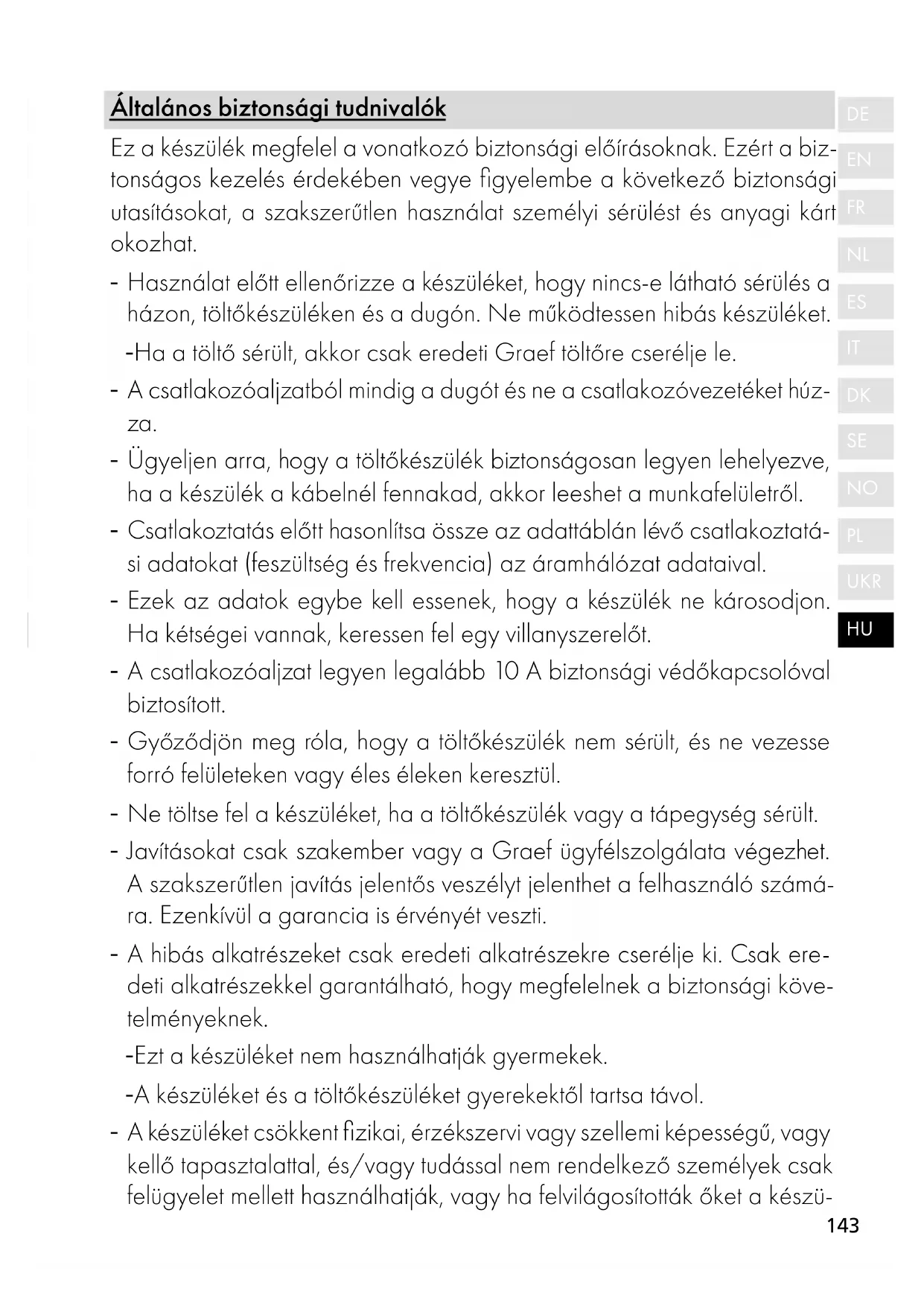 Általános biztonsági tudnivalók Ez a készülék megfelel a vonatkozó biztonsági előírásoknak. Ezért a biz- tonságos kezelés érdekében vegye figyelembe a következő biztonsági utasításokat, a szakszerűtlen használat személyi sérülést és anyagi kárt okozhat. - Használat előtt ellenőrizze a készüléket, hogy nincs-e látható sérülés a házon, töltőkészüléken és a dugón. Ne működtessen hibás készüléket. - Ha a töltő sérült, akkor csak eredeti Graef töltőre cserélje le. - A csatlakozóaljzatból mindig a dugót és ne a csatlakozóvezetéket húz- za. - Ügyeljen arra, hogy a töltőkészülék biztonságosan legyen lehelyezve, ha a készülék a kábelnél fennakad, akkor leeshet a munkafelületről. - Csatlakoztatás előtt hasonlítsa össze az adattáblán lévő csatlakoztatá- si adatokat (feszültség és frekvencia) az áramhálózat adataival. - Ezek az adatok egybe kell essenek, hogy a készülék ne károsodjon. Ha kétségei vannak, keressen fel egy villanyszerelőt. - A csatlakozóaljzat legyen legalább 10 A biztonsági védőkapcsolóval biztosított. - Győződjön meg róla, hogy a töltőkészülék nem sérült, és ne vezesse forró felületeken vagy éles éleken keresztül. - Ne töltse fel a készüléket, ha a töltőkészülék vagy a tápegység sérült. - Javításokat csak szakember vagy a Graef ügyfélszolgálata végezhet. A szakszerűtlen javítás jelentős veszélyt jelenthet a felhasználó számá- ra. Ezenkívül a garancia is érvényét veszti. - A hibás alkatrészeket csak eredeti alkatrészekre cserélje ki. Csak ere- deti alkatrészekkel garantálható, hogy megfelelnek a biztonsági köve- telményeknek. - Ezt a készüléket nem használhatják gyermekek. - A készüléket és a töltőkészüléket gyerekektől tartsa távol. - A készüléket csökkent fizikai, érzékszervi vagy szellemi képességű, vagy kellő tapasztalattal, és/vagy tudással nem rendelkező személyek csak felügyelet mellett használhatják, vagy ha felvilágosították őket a készü-144 lék biztonságos használatáról és megértették a lehetséges veszélyeket. - Gyermekek nem játszhatnak a készülékkel. - A készülék rendeltetésének megfelelően nem használható külső időkapcsolóval vagy külön távirányítóval. - A csomagolóanyag nem használható játékszerként. Fulladásveszély áll fenn. - Az össze-, vagy szétszerelés, illetve tisztítás előtt válassza le a készü- léket a hálózatról, és akkor is, ha nem áll felügyelet alatt. - Tartsa a készüléket hőtől és éles élektől távol, mert károsodást okozhat- nak. - Tartsa a készüléket egyéb hőleadó készülékektől távol. - Ne merítse a készüléket vízbe vagy más folyadékba. - A készüléket ne kezelje nedves kézzel. - Ne tegye ki a készüléket esőnek. - A készüléket ne tárolja közvetlen napfényen, vagy magas páratartalom mellett. - Ne használja a készüléket, ha egy nyílása blokkolt. - Ne használja a készüléket, ha éghető folyadékok, gyufaszál, ciga- rettacsikk, forró hamu vagy egyéb forró, éghető vagy füstölő tárgyak halmozódnak fel benne. - Ne használja a készüléket kemény, éles tárgyak, mint például üveg, köröm és hasonlók felemelésére. - Ne használja a készüléket víz vagy egyéb folyadékok felvételére, különben áramütés veszélye áll fenn. - Soha ne működtesse a készüléket szűrő nélkül.145