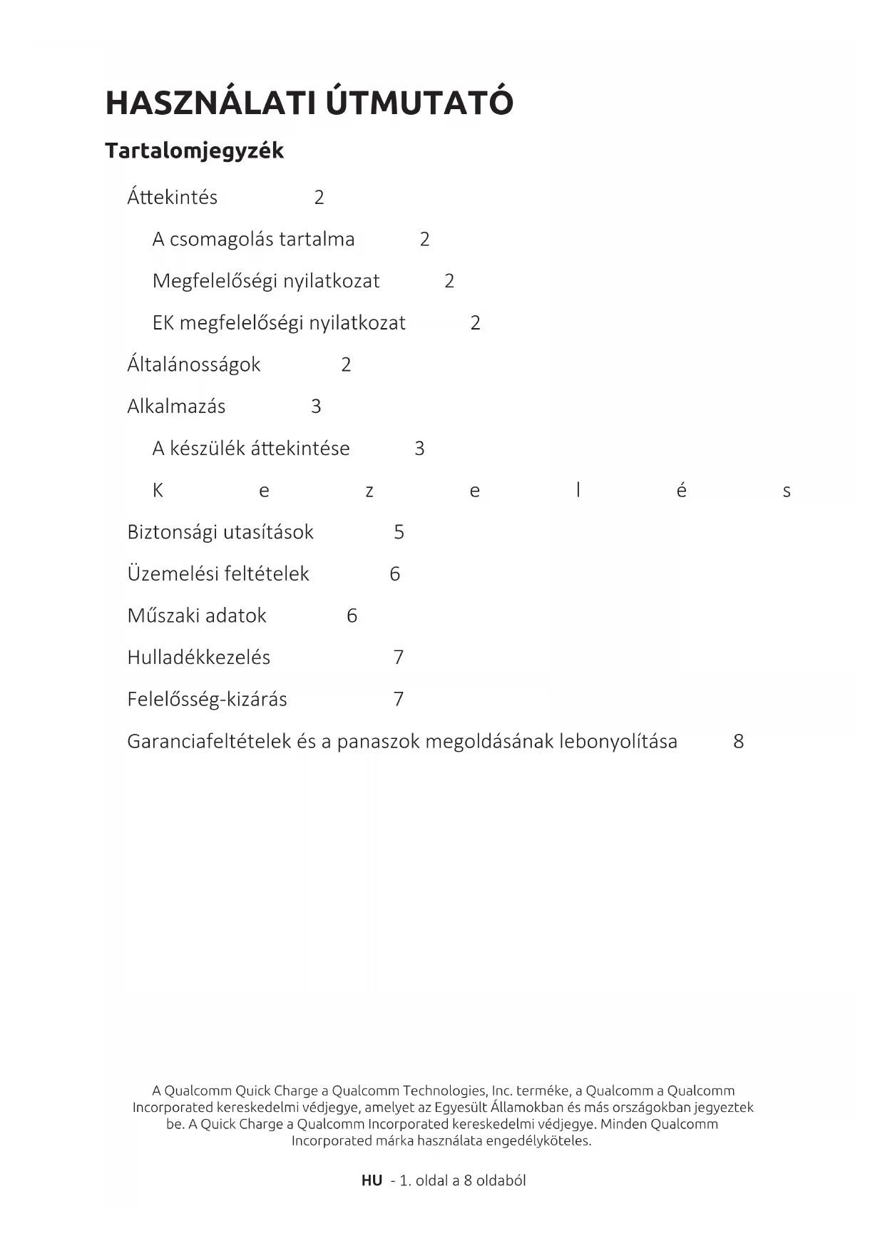 INTENSO INTERNATIONAL GMBH I Service Center (Vaše č. RMA) Kopernikusstraße 12-14 I D-49377 VechtaHASZNÁLATI ÚTMUTATÓ HU - 1. oldal a 8 oldaból Tartalomjegyzék Áekintés 2 Acsomagolástartalma 2 Megfelelőséginyilatkozat 2 EKmegfelelőséginyilatkozat 2 Általánosságok 2 Alkalmazás 3 Akészülékáekintése 3 Kezelés3 Biztonságiutasítások 5 Üzemelésifeltételek 6 Műszakiadatok 6 Hulladékkezelés 7 Felelősség-kizárás 7 Garanciafeltételekésapanaszokmegoldásánaklebonyolítása 8 A Qualcomm Quick Charge a Qualcomm Technologies, Inc. terméke, a Qualcomm a Qualcomm Incorporated kereskedelmi védjegye, amelyet az Egyesült Államokban és más országokban jegyeztek be. A Quick Charge a Qualcomm Incorporated kereskedelmi védjegye. Minden Qualcomm Incorporated márka használata engedélyköteles.HU -2.oldala8oldaból
