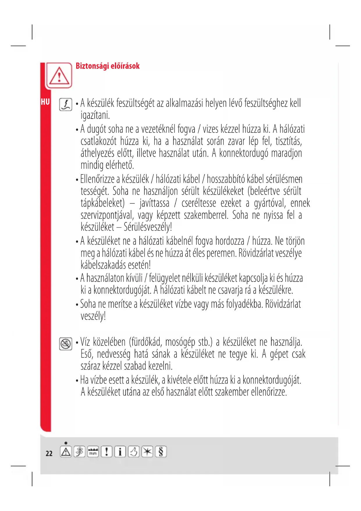 - Víz közelében (fürdőkád, mosógép stb.) a készüléket ne használja. Eső, nedvesség hatá sának a készüléket ne tegye ki. A gépet csak száraz kézzel szabad kezelni.23 Biztonsági előírások