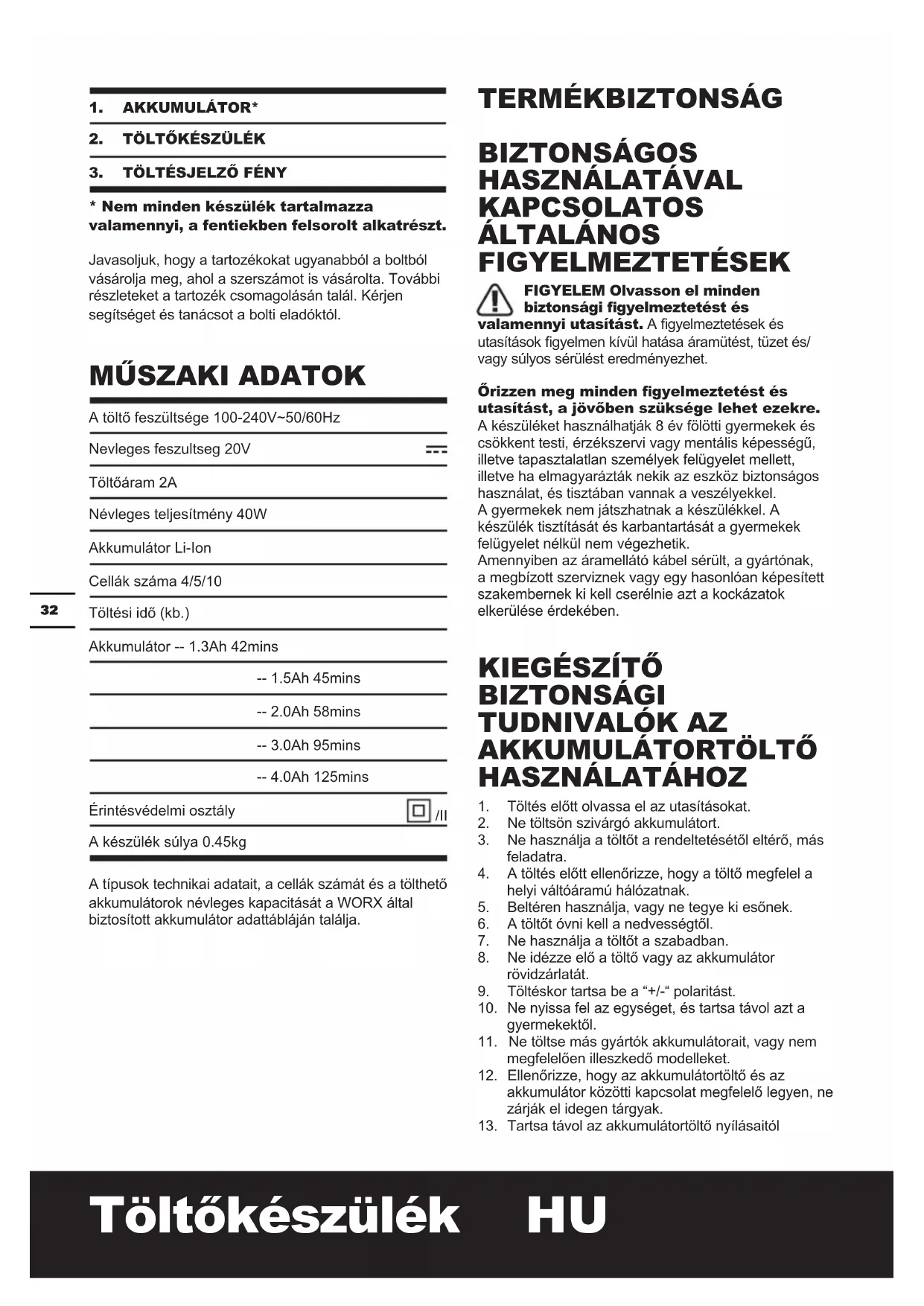 *Nemmindenkészüléktartalmazza valamennyi,afentiekbenfelsoroltalkatrészt. Javasoljuk, hogy a tartozékokat ugyanabból a boltból vásárolja meg, ahol a szerszámot is vásárolta. További részleteket a tartozék csomagolásán talál. Kérjen segítséget és tanácsot a bolti eladóktól. MŰSZAKIADATOK A töltő feszültsége 100-240V~50/60Hz Nevleges feszultseg 20V Töltőáram 2A Névleges teljesítmény 40W Akkumulátor Li-Ion Cellák száma 4/5/10 Töltési idő (kb.) Akkumulátor -- 1.3Ah 42mins -- 1.5Ah 45mins -- 2.0Ah 58mins -- 3.0Ah 95mins -- 4.0Ah 125mins Érintésvédelmi osztály /II A készülék súlya 0.45kg A típusok technikai adatait, a cellák számát és a tölthető akkumulátorok névleges kapacitását a WORX által biztosított akkumulátor adattábláján találja.