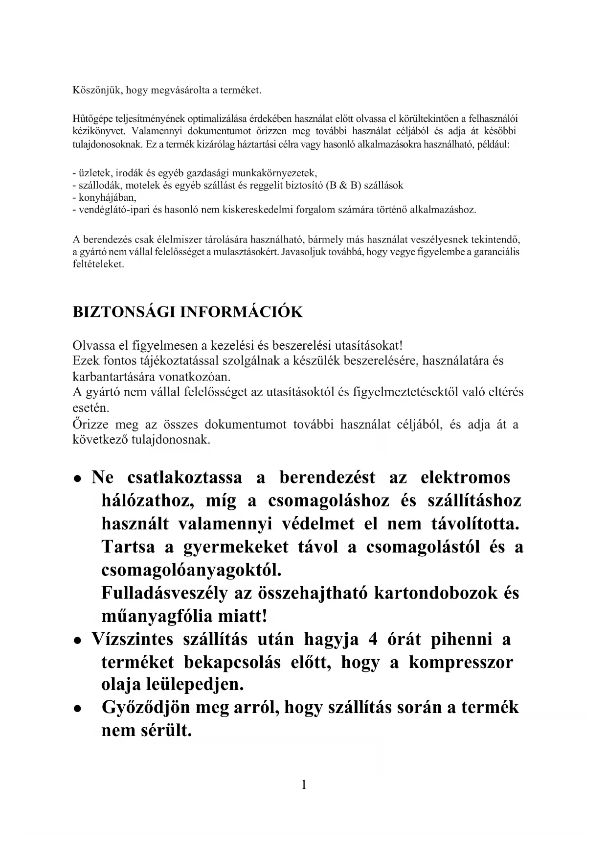 Olvassa el figyelmesen a kezelési és beszerelési utasításokat! Ezek fontos tájékoztatással szolgálnak a készülék beszerelésére, használatára és karbantartására vonatkozóan. A gyártó nem vállal felelősséget az utasításoktól és figyelmeztetésektől való eltérés esetén. Őrizze meg az összes dokumentumot további használat céljából, és adja át a következő tulajdonosnak. ● Ne csatlakoztassa a berendezést az elektromos hálózathoz, míg a csomagoláshoz és szállításhoz használt valamennyi védelmet el nem távolította. Tartsa a gyermekeket távol a csomagolástól és a csomagolóanyagoktól. Fulladásveszély az összehajtható kartondobozok és műanyagfólia miatt! ● Vízszintes szállítás után hagyja 4 órát pihenni a terméket bekapcsolás előtt, hogy a kompresszor olaja leülepedjen. ● Győződjön meg arról, hogy szállítás során a termék nem sérült.