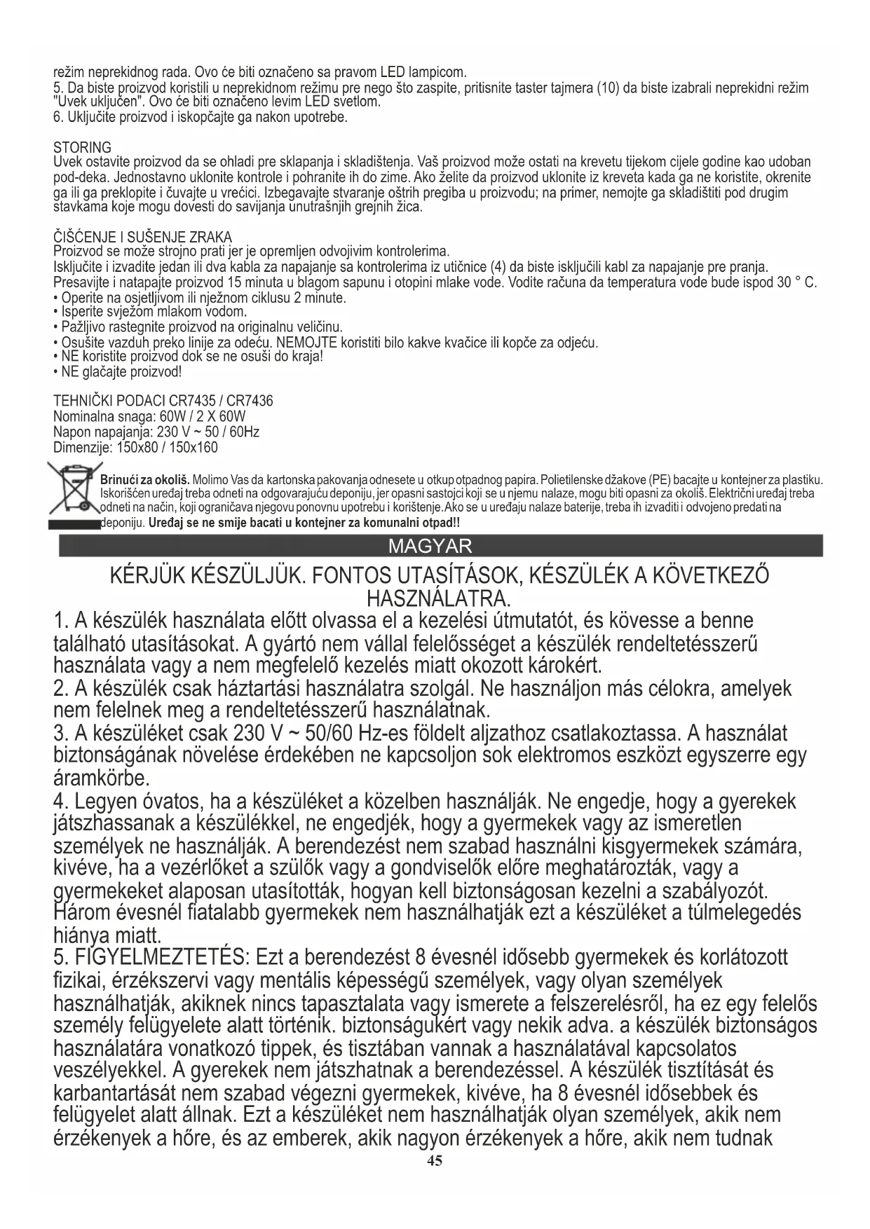 - FIgYELMEZTETES: Ezt a berendezest 8 evesnel idosebb gyermekek es korlatozott fizikai, erzekszervi vagy mentalis képessegu szemelyek, vagy oylan szemelyek hasznalhatjak, akiek nincs tapasztalata vagy ismerete a felszerelésrol, ha ez egy felelos szemely felugyelete alatt tortenik. biztonsagukert vagy nekik adva. a keszulékBiztonsagos hasznalatara vonatkozo tippek, es tisztaban vannak a hasznalatalaval kapcsolatos veszelyekkel. A gyerekek nem jatszhatnak a berendezessel. A keszulék tiszitatasat es karbantartasat nem szabad vegezni gyermekek, kiveve, ha 8 evesnel idosebbek es felugyelet alatt allnak. Ezt a keszuléket nem hasznalhatjak oyan szemelyek, akik nem erzekenyek a hore, es az emberek, akik nagyon erzekenyek a hore, akik nem tudnak