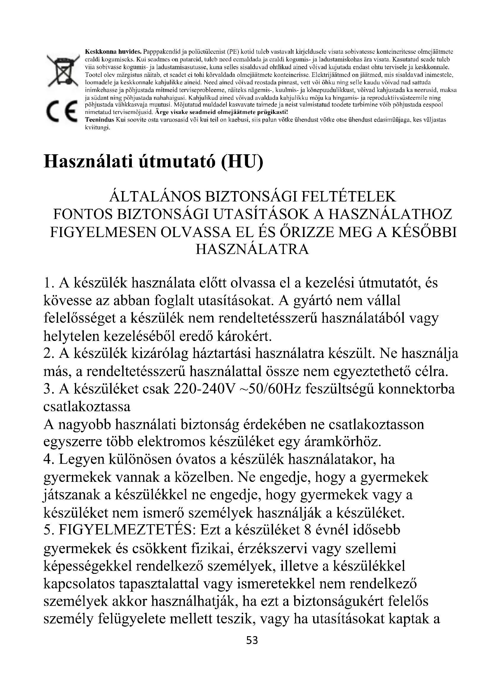 - FIGYELMEZTETÉS: Ezt a készüléket 8 évnel idösebb gyermekek és csökkent fizikai, érzékszervi vagy szellemi képességekkel rendelkező személyek, illetve a készülékkel kapcsolatos tapasztalattal vagy ismeretekkel nem rendelkező személyek akkor használhatják, ha ezt a biztonságukérf felelós személy felügyelete mellett teszik, vagy ha utasításokat kaptak a