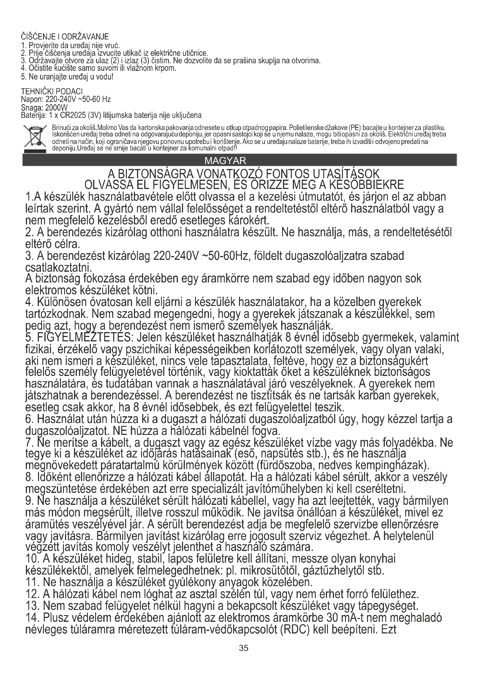 21. Ne használja a termoventilátort magas levego-paraftalmu helyiségekben - furdoszobák, zuhanyók, medencék stb. A nedvesség rovidzárlatot és a készülék meghibásodásat okozhatja.