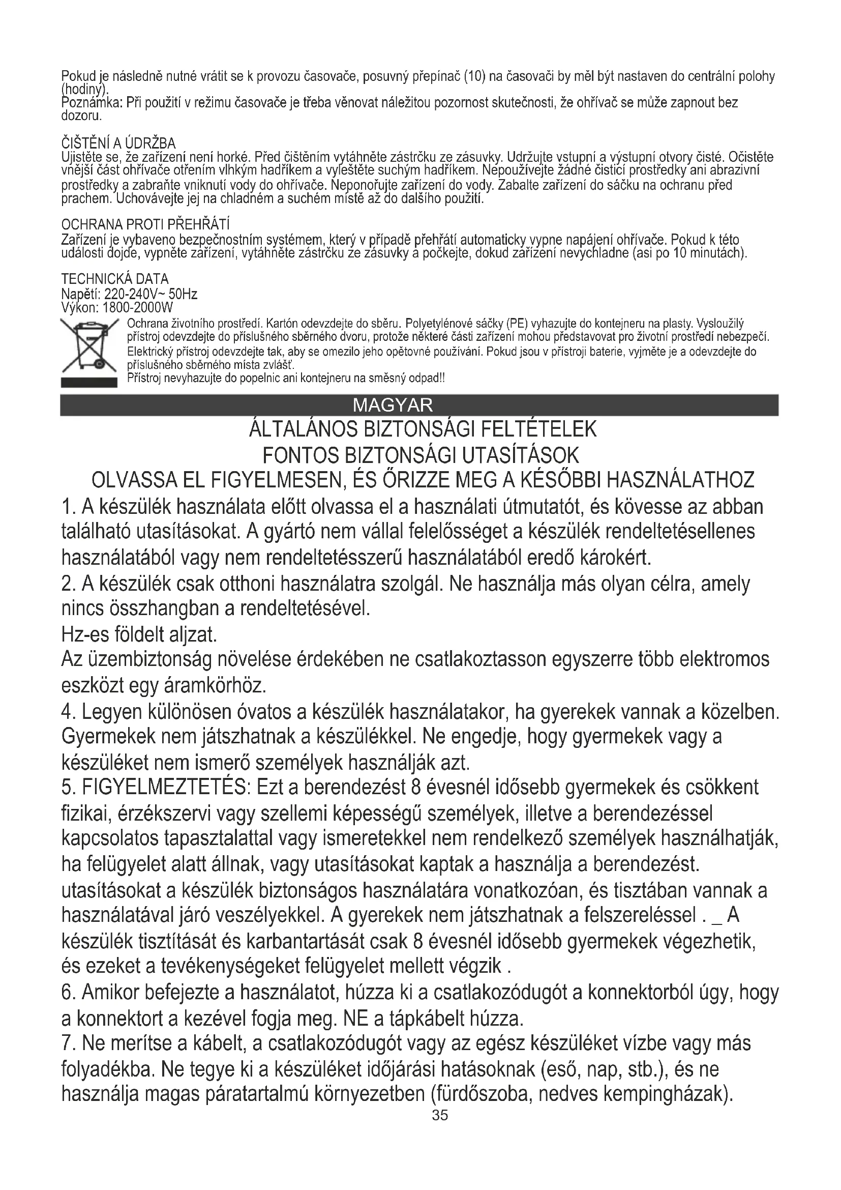 Feszültség: 220-240V~ 50Hz Teljesítmény: 1800-2000W A környezet védelme érdekében kérjük külön karton dobozok és műanyag zsákokat és dobja őket a megfelelő hulladék közé. Használt készüléket kell eljuttatni a kijelölt gyűjtőhelyekre miatt veszélyes elemek alkatrészeket, amelyek hatással lehetnek a környezetre. Ne dobja a készüléket a közös szemétkosárba. BOSANSKI