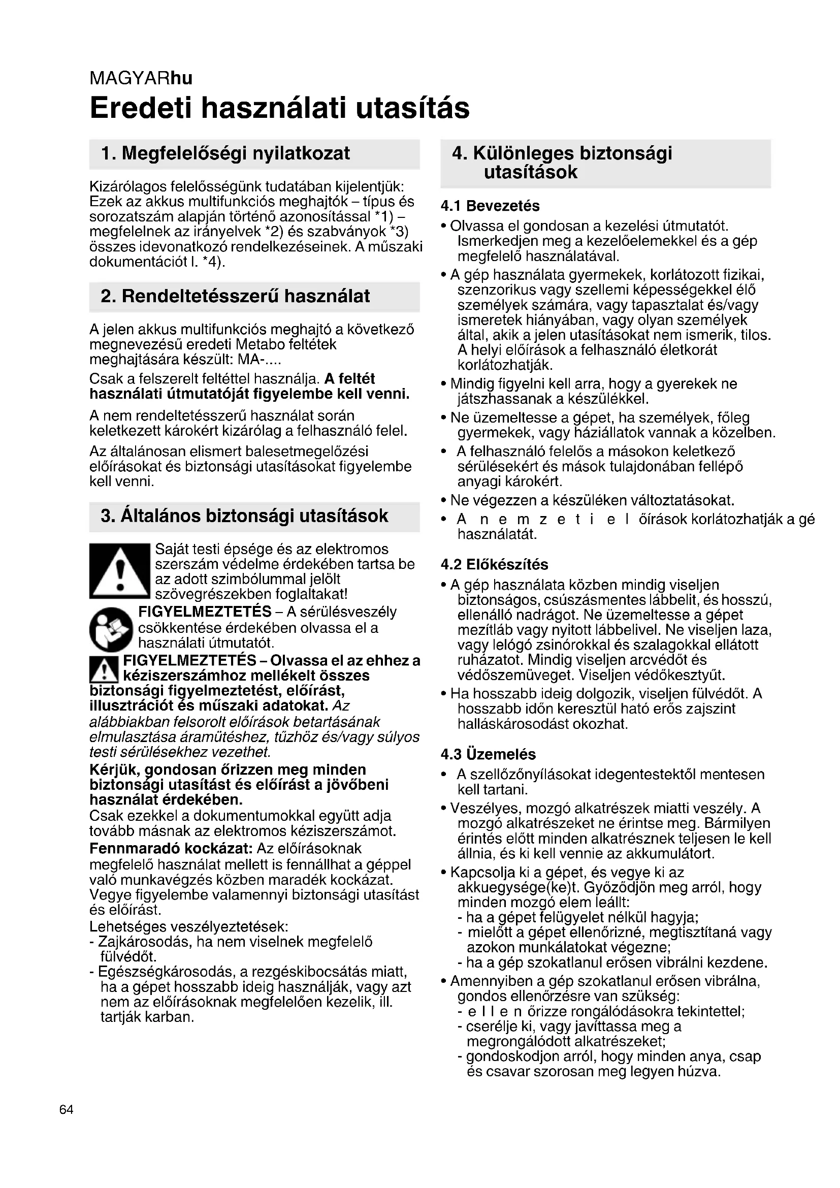 Eredeti használati utasítás Kizárólagos felelősségünk tudatában kijelentjük: Ezek az akkus multifunkciós meghajtók – típus és sorozatszám alapján történő azonosítással *1) – megfelelnek az irányelvek *2) és szabványok *3) összes idevonatkozó rendelkezéseinek. A műszaki dokumentációt l. *4). A jelen akkus multifunkciós meghajtó a következő megnevezésű eredeti Metabo feltétek meghajtására készült: MA-.... Csak a felszerelt feltéttel használja. A feltét használati útmutatóját figyelembe kell venni. A nem rendeltetésszerű használat során keletkezett károkért kizárólag a felhasználó felel. Az általánosan elismert balesetmegelőzési előírásokat és biztonsági utasításokat figyelembe kell venni. Saját testi épsége és az elektromos szerszám védelme érdekében tartsa be az adott szimbólummal jelölt szövegrészekben foglaltakat! FIGYELMEZTETÉS – A sérülésveszély csökkentése érdekében olvassa el a használati útmutatót. FIGYELMEZTETÉS – Olvassa el az ehhez a kéziszerszámhoz mellékelt összes biztonsági figyelmeztetést, előírást, illusztrációt és műszaki adatokat. Az alábbiakban felsorolt előírások betartásának elmulasztása áramütéshez, tűzhöz és/vagy súlyos testi sérülésekhez vezethet. Kérjük, gondosan őrizzen meg minden biztonsági utasítást és előírást a jövőbeni használat érdekében. Csak ezekkel a dokumentumokkal együtt adja tovább másnak az elektromos kéziszerszámot. Fennmaradó kockázat: Az előírásoknak megfelelő használat mellett is fennállhat a géppel való munkavégzés közben maradék kockázat. Vegye figyelembe valamennyi biztonsági utasítást és előírást. Lehetséges veszélyeztetések: - Zajkárosodás, ha nem viselnek megfelelő fülvédőt. - Egészségkárosodás, a rezgéskibocsátás miatt, ha a gépet hosszabb ideig használják, vagy azt nem az előírásoknak megfelelően kezelik, ill. tartják karban.