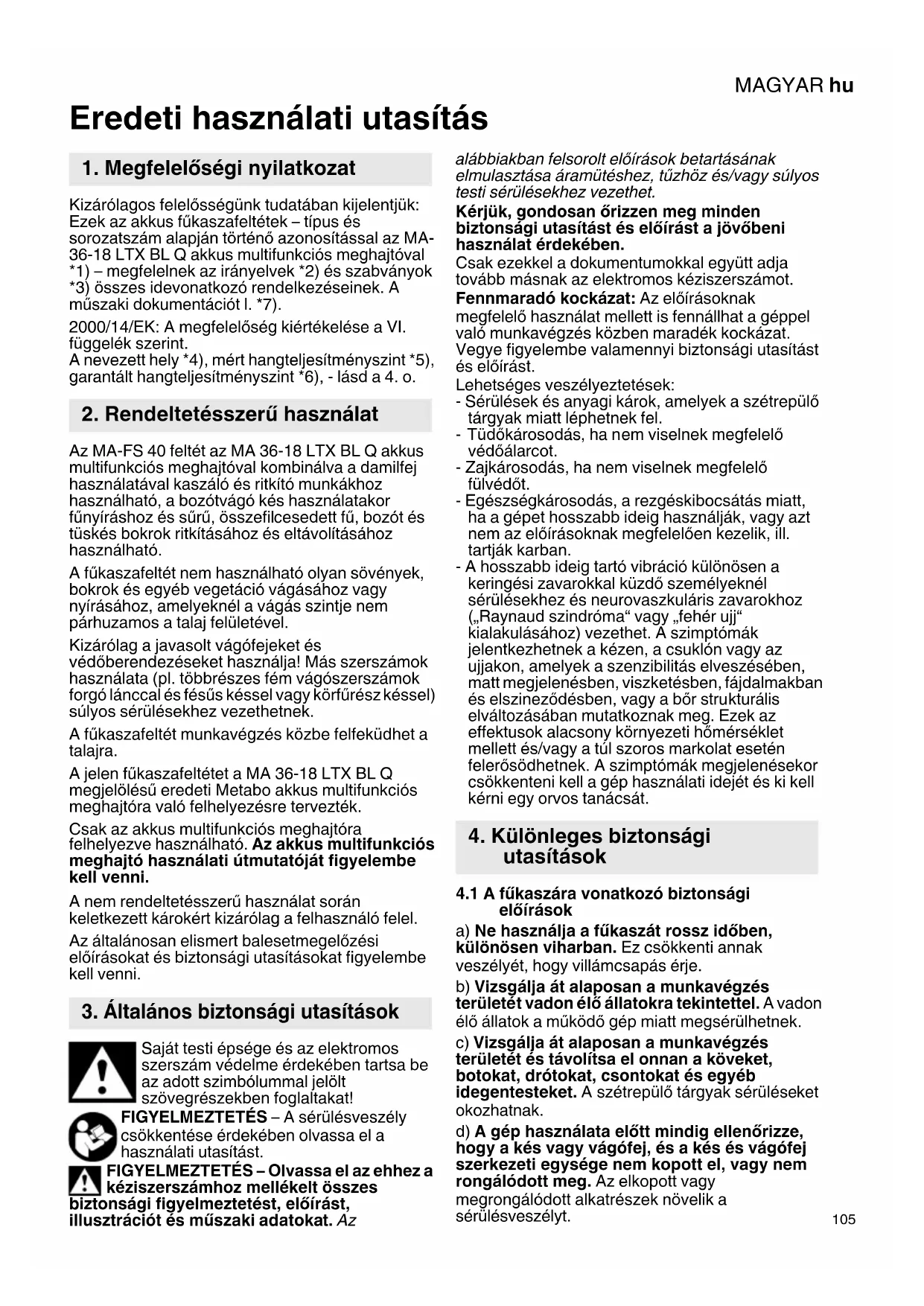 Eredeti használati utasítás Kizárólagos felelősségünk tudatában kijelentjük: Ezek az akkus fűkaszafeltétek – típus és sorozatszám alapján történő azonosítással az MA- 36-18 LTX BL Q akkus multifunkciós meghajtóval *1) – megfelelnek az irányelvek *2) és szabványok *3) összes idevonatkozó rendelkezéseinek. A műszaki dokumentációt l. *7). 2000/14/EK: A megfelelőség kiértékelése a VI. függelék szerint. A nevezett hely *4), mért hangteljesítményszint *5), garantált hangteljesítményszint *6), - lásd a 4. o. Az MA-FS 40 feltét az MA 36-18 LTX BL Q akkus multifunkciós meghajtóval kombinálva a damilfej használatával kaszáló és ritkító munkákhoz használható, a bozótvágó kés használatakor fűnyíráshoz és sűrű, összefilcesedett fű, bozót és tüskés bokrok ritkításához és eltávolításához használható. A fűkaszafeltét nem használható olyan sövények, bokrok és egyéb vegetáció vágásához vagy nyírásához, amelyeknél a vágás szintje nem párhuzamos a talaj felületével. Kizárólag a javasolt vágófejeket és védőberendezéseket használja! Más szerszámok használata (pl. többrészes fém vágószerszámok forgó lánccal és fésűs késsel vagy körfűrész késsel) súlyos sérülésekhez vezethetnek. A fűkaszafeltét munkavégzés közbe felfeküdhet a talajra. A jelen fűkaszafeltétet a MA 36-18 LTX BL Q megjelölésű eredeti Metabo akkus multifunkciós meghajtóra való felhelyezésre tervezték. Csak az akkus multifunkciós meghajtóra felhelyezve használható. Az akkus multifunkciós meghajtó használati útmutatóját figyelembe kell venni. A nem rendeltetésszerű használat során keletkezett károkért kizárólag a felhasználó felel. Az általánosan elismert balesetmegelőzési előírásokat és biztonsági utasításokat figyelembe kell venni. Saját testi épsége és az elektromos szerszám védelme érdekében tartsa be az adott szimbólummal jelölt szövegrészekben foglaltakat! FIGYELMEZTETÉS – A sérülésveszély csökkentése érdekében olvassa el a használati utasítást. FIGYELMEZTETÉS – Olvassa el az ehhez a kéziszerszámhoz mellékelt összes biztonsági figyelmeztetést, előírást, illusztrációt és műszaki adatokat. Az alábbiakban felsorolt előírások betartásának elmulasztása áramütéshez, tűzhöz és/vagy súlyos testi sérülésekhez vezethet. Kérjük, gondosan őrizzen meg minden biztonsági utasítást és előírást a jövőbeni használat érdekében. Csak ezekkel a dokumentumokkal együtt adja tovább másnak az elektromos kéziszerszámot. Fennmaradó kockázat: Az előírásoknak megfelelő használat mellett is fennállhat a géppel való munkavégzés közben maradék kockázat. Vegye figyelembe valamennyi biztonsági utasítást és előírást. Lehetséges veszélyeztetések: - Sérülések és anyagi károk, amelyek a szétrepülő tárgyak miatt léphetnek fel. -Tüdőkárosodás, ha nem viselnek megfelelő védőálarcot. - Zajkárosodás, ha nem viselnek megfelelő fülvédőt. - Egészségkárosodás, a rezgéskibocsátás miatt, ha a gépet hosszabb ideig használják, vagy azt nem az előírásoknak megfelelően kezelik, ill. tartják karban. - A hosszabb ideig tartó vibráció különösen a keringési zavarokkal küzdő személyeknél sérülésekhez és neurovaszkuláris zavarokhoz („Raynaud szindróma“ vagy „fehér ujj“ kialakulásához) vezethet. A szimptómák jelentkezhetnek a kézen, a csuklón vagy az ujjakon, amelyek a szenzibilitás elveszésében, matt megjelenésben, viszketésben, fájdalmakban és elszineződésben, vagy a bőr strukturális elváltozásában mutatkoznak meg. Ezek az effektusok alacsony környezeti hőmérséklet mellett és/vagy a túl szoros markolat esetén felerősödhetnek. A szimptómák megjelenésekor csökkenteni kell a gép használati idejét és ki kell kérni egy orvos tanácsát.