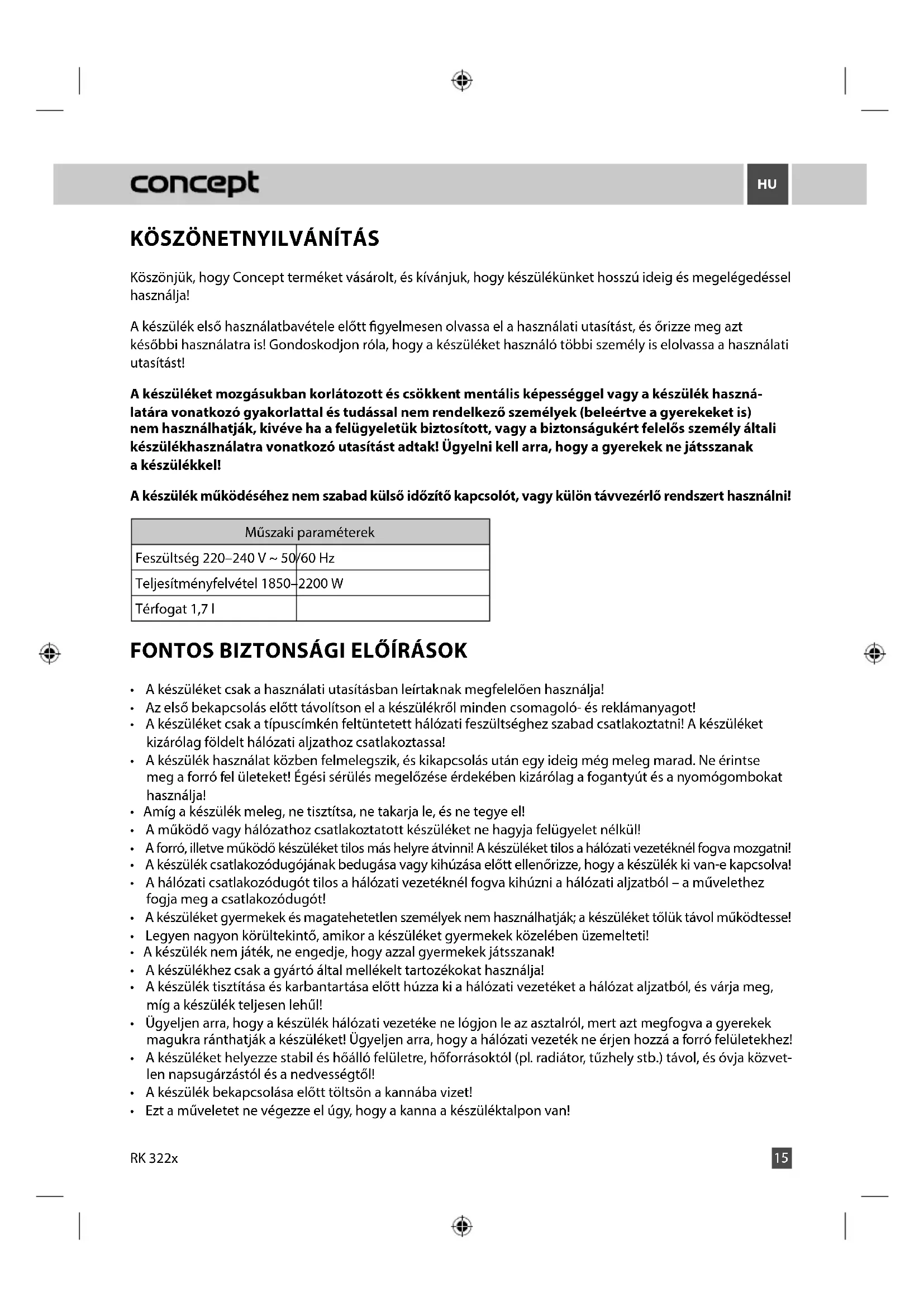 Köszönjük, hogy Concept terméket vásárolt, és kívánjuk, hogy készülékünket hosszú ideig és megelégedéssel használja! A készülék első használatbavétele előtt gyelmesen olvassa el a használati utasítást, és őrizze meg azt későbbi használatra is! Gondoskodjon róla, hogy a készüléket használó többi személy is elolvassa a használati utasítást! A készüléket mozgásukban korlátozott és csökkent mentális képességgel vagy a készülék haszná- latára vonatkozó gyakorlattal és tudással nem rendelkező személyek (beleértve a gyerekeket is) nem használhatják, kivéve ha a felügyeletük biztosított, vagy a biztonságukért felelős személy általi készülékhasználatra vonatkozó utasítást adtak! Ügyelni kell arra, hogy a gyerekek ne játsszanak a készülékkel! A készülék működéséhez nem szabad külső időzítő kapcsolót, vagy külön távvezérlő rendszert használni! Műszaki paraméterek Feszültség 220–240 V ~ 50/60 Hz Teljesítményfelvétel 1850–2200 W Térfogat 1,7 l