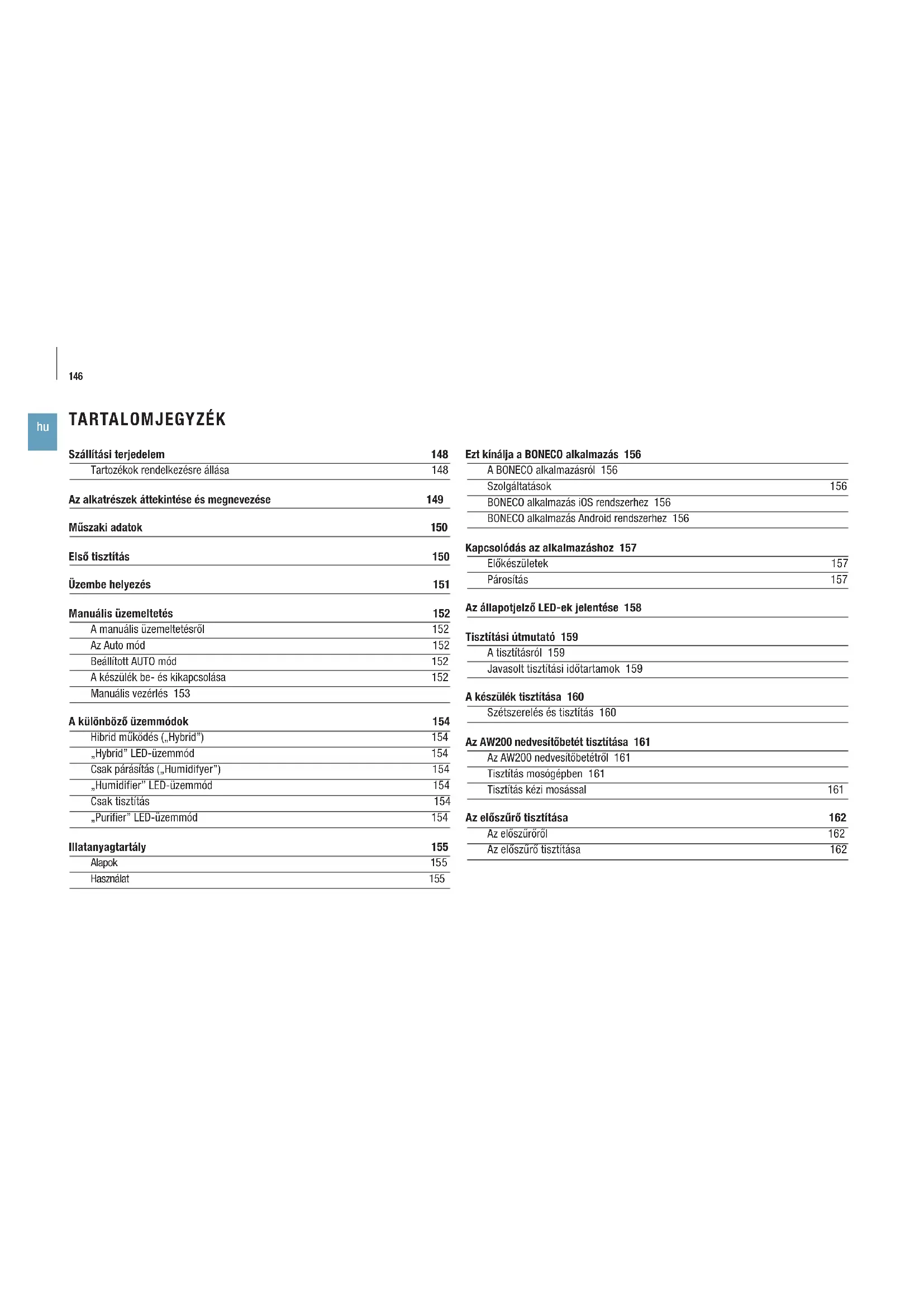 Ezt kínálja a BONECO alkalmazás 156 A BONECO alkalmazásról 156 Szolgáltatások 156 BONECO alkalmazás iOS rendszerhez 156 BONECO alkalmazás Android rendszerhez 156 Kapcsolódás az alkalmazáshoz 157 Előkészületek 157 Párosítás 157 Az állapotjelző LED-ek jelentése 158 Tisztítási útmutató 159 A tisztításról 159 Javasolt tisztítási időtartamok 159 A készülék tisztítása 160 Szétszerelés és tisztítás 160 Az AW200 nedvesítőbetét tisztítása 161 Az AW200 nedvesítőbetétről 161 Tisztítás mosógépben 161 Tisztítás kézi mosással 161 Az előszűrő tisztítása 162 Az előszűrőről 162 Az előszűrő tisztítása 162 Szállítási terjedelem 148 Tartozékok rendelkezésre állása 148 Az alkatrészek áttekintése és megnevezése 149 Műszaki adatok 150 Első tisztítás 150 Üzembe helyezés 151 Manuális üzemeltetés 152 A manuális üzemeltetésről 152 Az Auto mód 152 Beállított AUTO mód 152 A készülék be- és kikapcsolása 152 Manuális vezérlés 153 A különböző üzemmódok 154 Hibrid működés („Hybrid”) 154 „Hybrid” LED-üzemmód 154 Csak párásítás („Humidifyer”) 154 „Humidifier” LED-üzemmód 154 Csak tisztítás 154 „Purifier” LED-üzemmód 154 Illatanyagtartály 155 Alapok 155 Használat 155 TARTALOMJEGYZÉKA tartozékok cseréje 163 Az A7017 Ionic Silver Stick