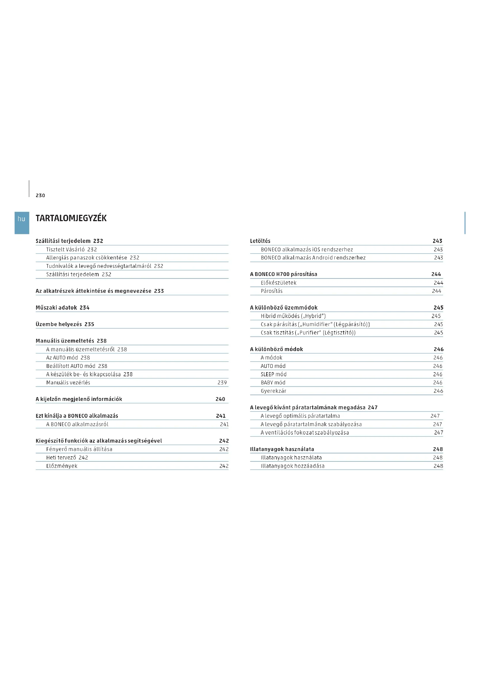 TARTALOMJEGYZÉK Szállítási terjedelem 232 Tisztelt Vásárló 232 Allergiás panaszok csökkentése 232 Tudnivalók a levegő nedvességtartalmáról 232 Szállítási terjedelem 232 Az alkatrészek áttekintése és megnevezése 233 Műszaki adatok 234 Üzembe helyezés 235 Manuális üzemeltetés 238 A manuális üzemeltetésről 238 Az AUTO mód 238 Beállított AUTO mód 238 A készülék be- és kikapcsolása 238 Manuális vezérlés 239 A kijelzőn megjelenő információk 240 Ezt kínálja a BONECO alkalmazás 241 A BONECO alkalmazásról 241 Kiegészítő funkciók az alkalmazás segítségével 242 Fényerő manuális állítása 242 Heti tervező 242 Előzmények 242 Letöltés 243 BONECO alkalmazás iOS rendszerhez 243 BONECO alkalmazás Android rendszerhez 243 A BONECO H700 párosítása 244 Előkészületek 244 Párosítás 244 A különböző üzemmódok 245 Hibrid működés („Hybrid”) 245 Csak párásítás („Humidifier” (Légpárásító)) 245 Csak tisztítás („Purifier” (Légtisztító)) 245 A különböző módok 246 A módok 246 AUTO mód 246 SLEEP mód 246 BABY mód 246 Gyerekzár 246 A levegő kívánt páratartalmának megadása 247 A levegő optimális páratartalma 247 A levegő páratartalmának szabályozása 247 A ventilációs fokozat szabályozása 247 Illatanyagok használata 248 Illatanyagok használata 248 Illatanyagok hozzáadása 248231