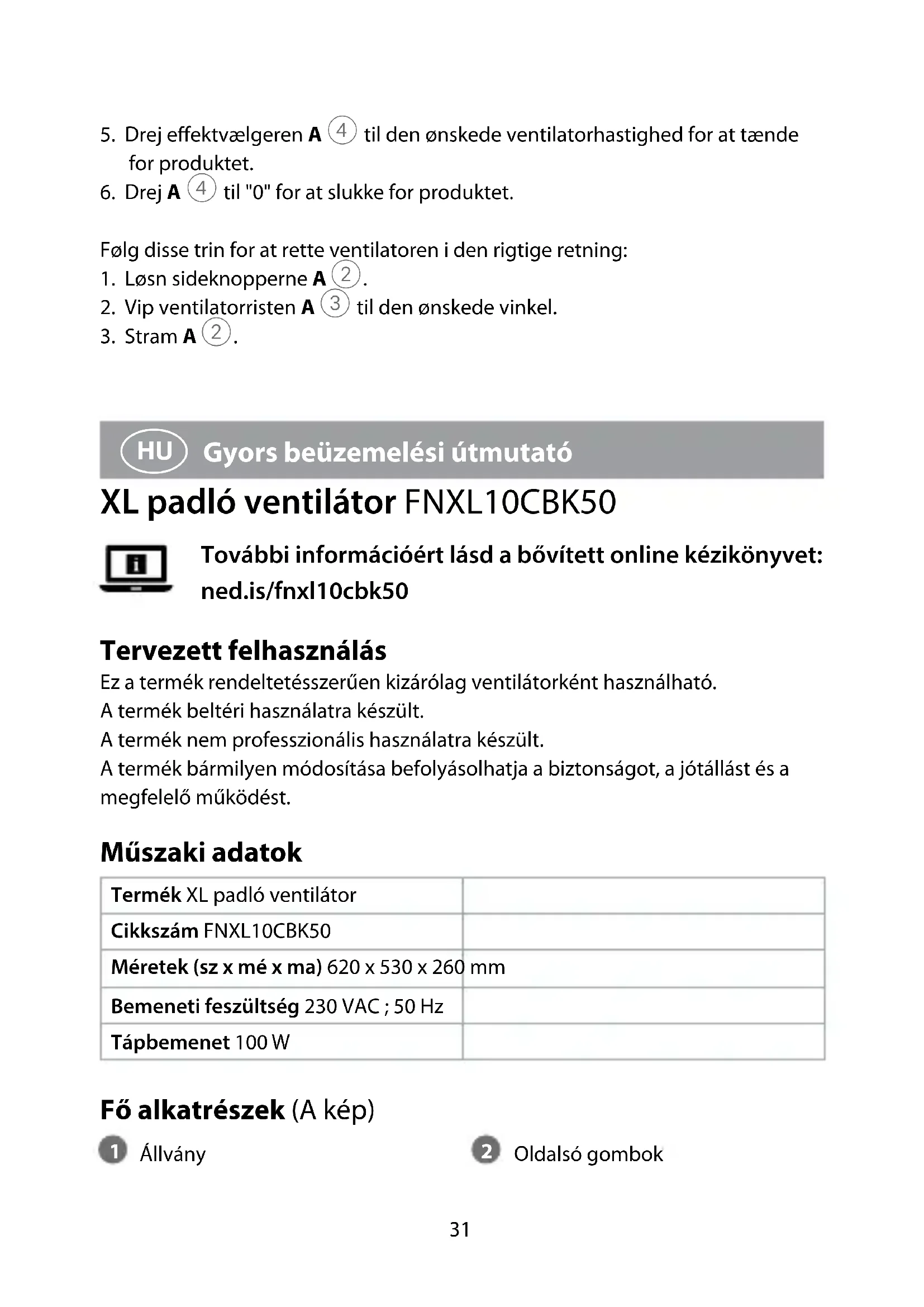 Gyors beüzemelési útmutató XL padló ventilátor FNXL10CBK50 További információért lásd a bővített online kézikönyvet: ned.is/fnxl10cbk50 Tervezett felhasználás Ez a termék rendeltetésszerűen kizárólag ventilátorként használható. A termék beltéri használatra készült. A termék nem professzionális használatra készült. A termék bármilyen módosítása befolyásolhatja a biztonságot, a jótállást és a megfelelő működést. Műszaki adatok Termék XL padló ventilátor Cikkszám FNXL10CBK50 Méretek (sz x mé x ma) 620 x 530 x 260 mm Bemeneti feszültség 230 VAC ; 50 Hz Tápbemenet 100 W Fő alkatrészek (A kép)