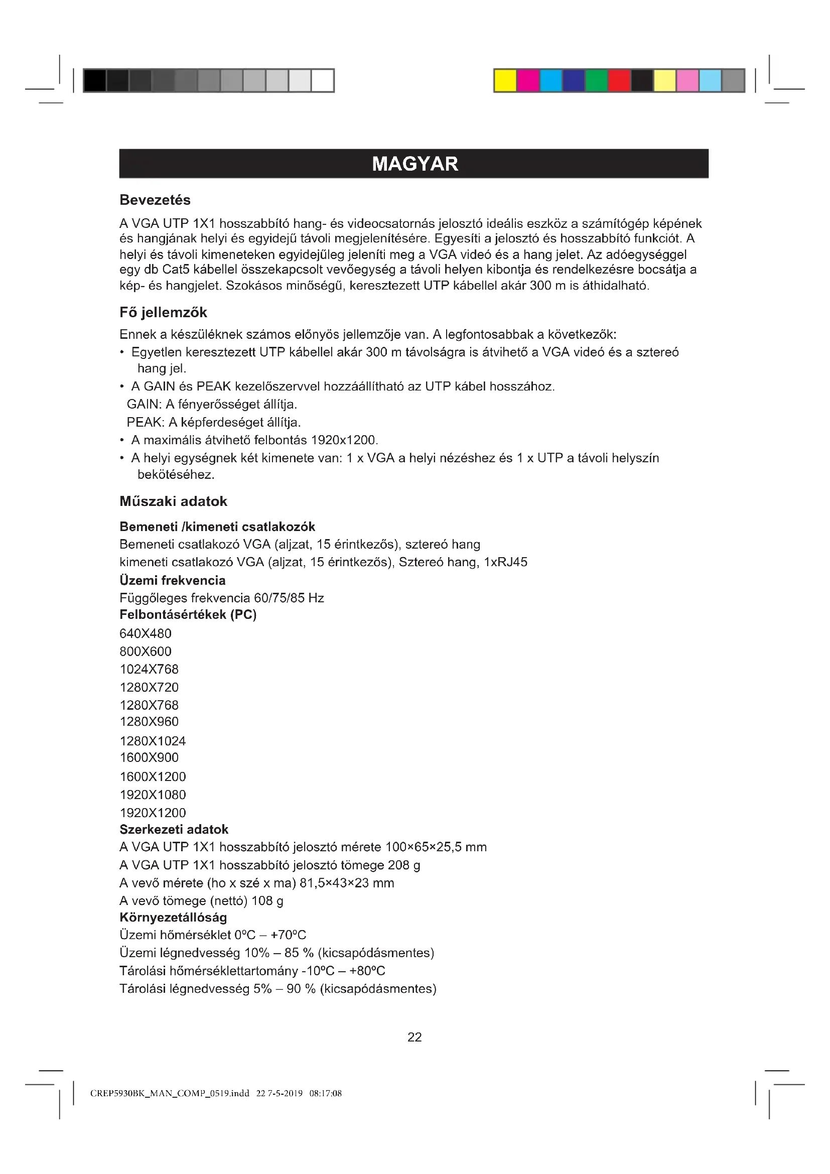 NO ABRIR ATENCIÓN CREP5930BK_MAN_COMP_0519.indd 21 7-5-2019 08:17:0822 MAGYAR Bevezetés A VGA UTP 1X1 hosszabbító hang- és videocsatornás jelosztó ideális eszköz a számítógép képének és hangjának helyi és egyidejű távoli megjelenítésére. Egyesíti a jelosztó és hosszabbító funkciót. A helyi és távoli kimeneteken egyidejűleg jeleníti meg a VGA videó és a hang jelet. Az adóegységgel egy db Cat5 kábellel összekapcsolt vevőegység a távoli helyen kibontja és rendelkezésre bocsátja a kép- és hangjelet. Szokásos minőségű, keresztezett UTP kábellel akár 300 m is áthidalható. Fő jellemzők Ennek a készüléknek számos előnyös jellemzője van. A legfontosabbak a következők: