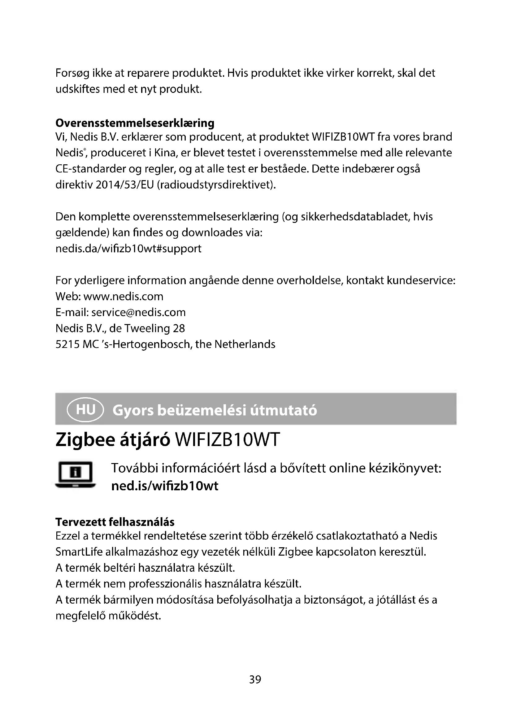 Gyors beüzemelési útmutató Zigbee átjáró WIFIZB10WT További információért lásd a bővített online kézikönyvet: ned.is/wizb10wt Tervezett felhasználás Ezzel a termékkel rendeltetése szerint több érzékelő csatlakoztatható a Nedis SmartLife alkalmazáshoz egy vezeték nélküli Zigbee kapcsolaton keresztül. A termék beltéri használatra készült. A termék nem professzionális használatra készült. A termék bármilyen módosítása befolyásolhatja a biztonságot, a jótállást és a megfelelő működést.40 Műszaki adatok Termék Zigbee átjáró Cikkszám WIFIZB10WT Méretek (h x sz x m) 61 x 61 x 16 mm Bemeneti feszültség 5 VDC Zigbee átviteli protokoll IEEE802.15.4 Wi-Fi átviteli protokoll 802.11bgn Zigbee frekvenciatartomány 2400–2480 GHz Wi-Fi frekvenciatartomány 2400–2484 GHz Zigbee adótávolság Akár 35 m Wi-Fi adótávolság Akár 90 m Maximális jeladási teljesítmény 19 dB Antennaerősítés 2,5 dB Üzemi hőmérséklet -10 °C - 55 °C Üzemi páratartalom < 90 % relatív páratartalom Operációs rendszer támogatás Android, iOS Fő alkatrészek (A kép)
