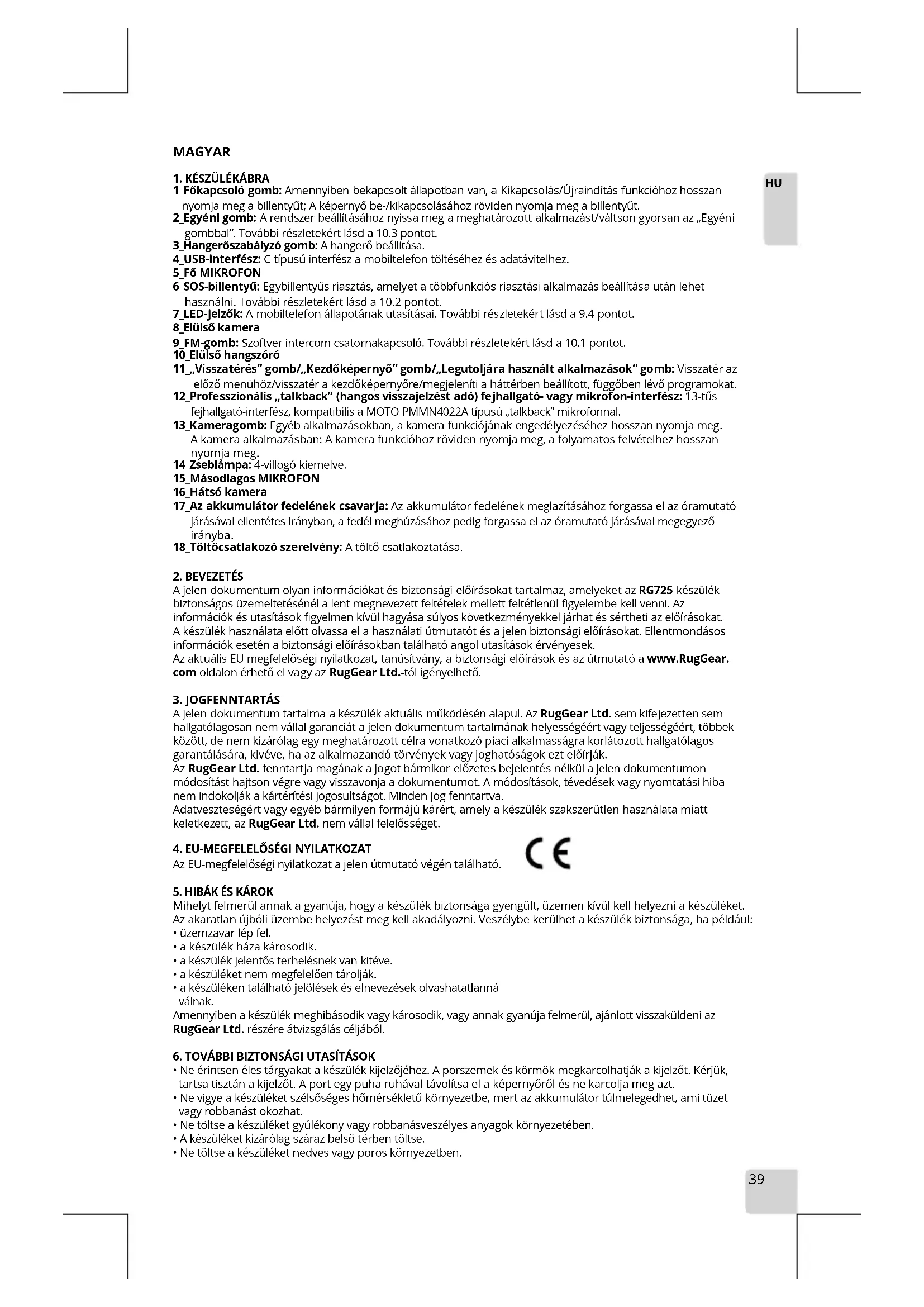 A jelen dokumentum olyan információkat és biztonsági előírásokat tartalmaz, amelyeket az RG725 készülék biztonságos üzemeltetésénél a lent megnevezett feltételek mellett feltétlenül figyelembe kell venni. Az információk és utasítások figyelmen kívül hagyása súlyos következményekkel járhat és sértheti az előírásokat. A készülék használata előtt olvassa el a használati útmutatót és a jelen biztonsági előírásokat. Ellentmondásos információk esetén a biztonsági előírásokban található angol utasítások érvényesek. Az aktuális EU megfelelőségi nyilatkozat, tanúsítvány, a biztonsági előírások és az útmutató a www.RugGear. com oldalon érhető el vagy az RugGear Ltd.-tól igényelhető.