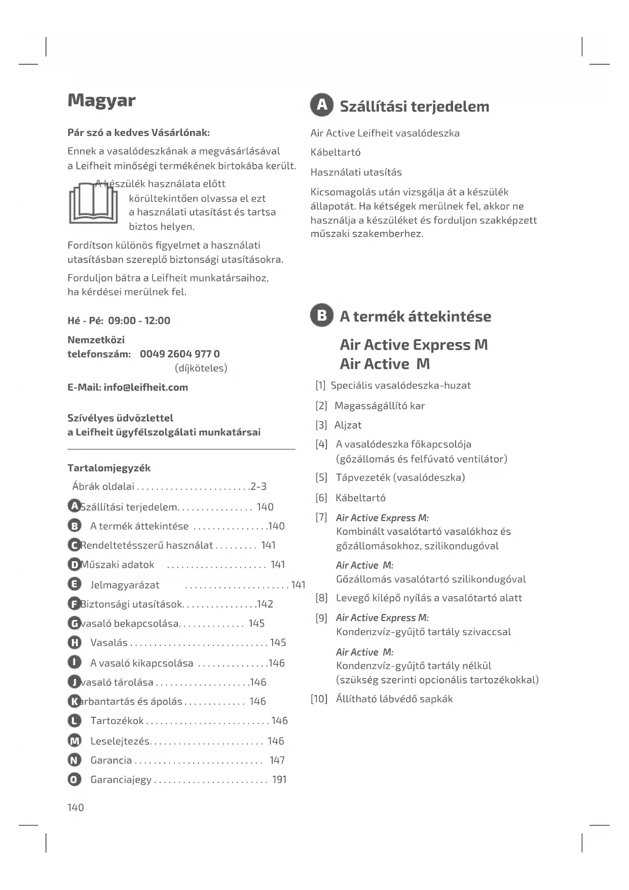 - Garanciajegy Air Active Leifheit vasalódeszka Kábeltartó Használatiutasítás Kicsomagolás után vizsgálja át a készülék állapotát. Ha kétségek merülnek fel, akkor ne használja a készüléket és forduljon szakképzett műszakiszakemberhez. p. 191