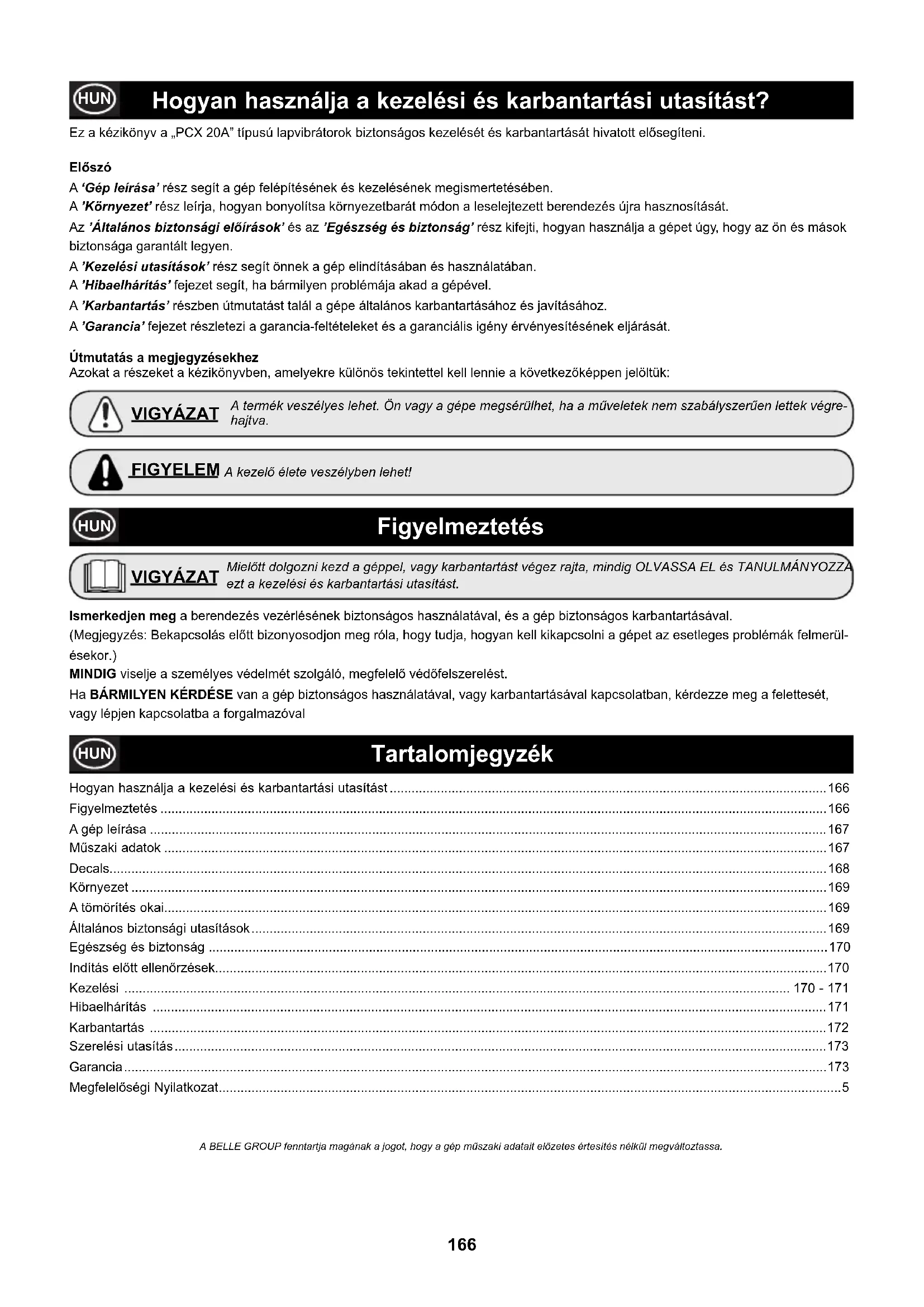 - MegfelelÚségi Nyilatkozat Hogyan használja a kezelési és karbantartási utasítást? HUN Miel<tt dolgozni kezd a géppel, vagy karbantartást végez rajta, mindig OLVASSA EL és TANULMÁNYOZZA ezt a kezelési és karbantartási utasítást. VIGYÁZAT A termék veszélyes lehet. Ön vagy a gépe megsérülhet, ha a m=veletek nem szabályszer=en lettek végre- hajtva. VIGYÁZAT A kezel< élete veszélyben lehet! FIGYELEM Figyelmeztetés HUN Tartalomjegyzék Ismerkedjen meg a berendezés vezérlésének biztonságos használatával, és a gép biztonságos karbantartásával. (Megjegyzés: Bekapcsolás elÚtt bizonyosodjon meg róla, hogy tudja, hogyan kell kikapcsolni a gépet az esetleges problémák felmerül- ésekor.) MINDIG viselje a személyes védelmét szolgáló, megfelelÚ védÚfelszerelést. Ha BÁRMILYEN KÉRDÉSE van a gép biztonságos használatával, vagy karbantartásával kapcsolatban, kérdezze meg a felettesét, vagy lépjen kapcsolatba a forgalmazóval HUN Ez a kézikönyv a „PCX 20A” típusú lapvibrátorok biztonságos kezelését és karbantartását hivatott elÚsegíteni. Elszó A ‘Gép leírása’ rész segít a gép felépítésének és kezelésének megismertetésében. A ’Környezet’ rész leírja, hogyan bonyolítsa környezetbarát módon a leselejtezett berendezés újra hasznosítását. Az ’Általános biztonsági elírások’ és az ’Egészség és biztonság’ rész kifejti, hogyan használja a gépet úgy, hogy az ön és mások biztonsága garantált legyen. A ’Kezelési utasítások’ rész segít önnek a gép elindításában és használatában. A ’Hibaelhárítás’ fejezet segít, ha bármilyen problémája akad a gépével. A ’Karbantartás’ részben útmutatást talál a gépe általános karbantartásához és javításához. A ’Garancia’ fejezet részletezi a garancia-feltételeket és a garanciális igény érvényesítésének eljárását. Útmutatás a megjegyzésekhez Azokat a részeket a kézikönyvben, amelyekre különös tekintettel kell lennie a következÚképpen jelöltük: A BELLE GROUP fenntartja magának a jogot, hogy a gép m=szaki adatait el<zetes értesítés nélkül megváltoztassa.167 A gép leírása HUN p. 5