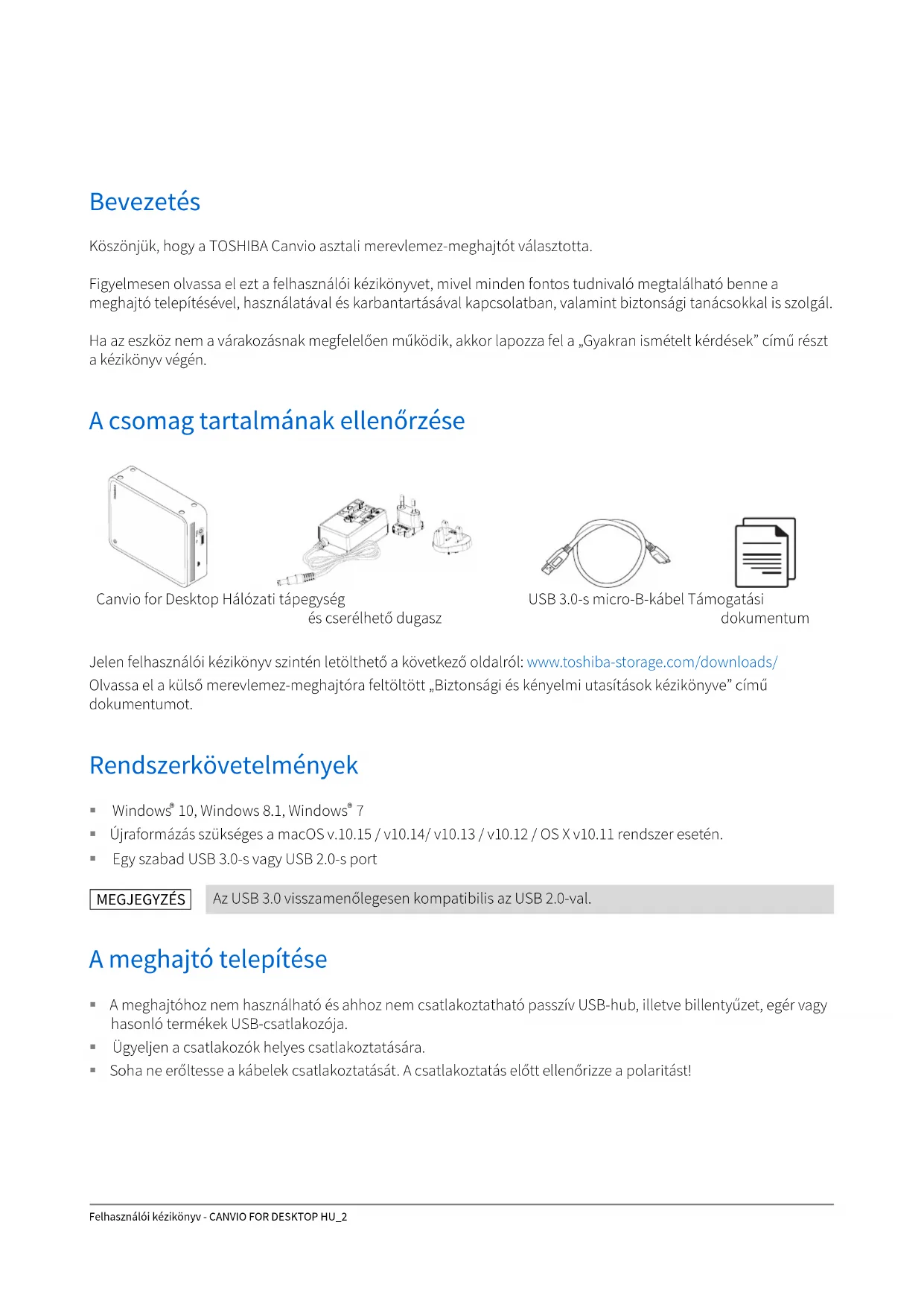 - Megfelelőséggel kapcsolatos nyilatkozatok Felhasználói kézikönyv - CANVIO FOR DESKTOP HU_2 Bevezetés Köszönjük, hogy a TOSHIBA Canvio asztali merevlemez-meghajtót választotta. Figyelmesen olvassa el ezt a felhasználói kézikönyvet, mivel minden fontos tudnivaló megtalálható benne a meghajtó telepítésével, használatával és karbantartásával kapcsolatban, valamint biztonsági tanácsokkal is szolgál. Ha az eszköz nem a várakozásnak megfelelően működik, akkor lapozza fel a „Gyakran ismételt kérdések” című részt a kézikönyv végén. A csomag tartalmának ellenőrzése Jelen felhasználói kézikönyv szintén letölthető a következő oldalról: www.toshiba-storage.com/downloads/ Olvassa el a külső merevlemez-meghajtóra feltöltött „Biztonsági és kényelmi utasítások kézikönyve” című dokumentumot. Rendszerkövetelmények Windows p. 7