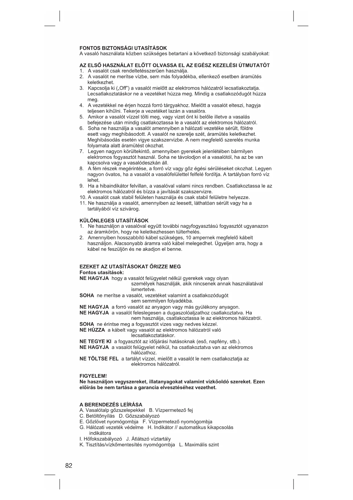 használjon. Alacsonyabb áramra való kábel melegedhet. Ügyeljen arra, hogy a kábel ne feszüljön és ne akadjon el benne. EZEKET AZ UTASÍTÁSOKAT ŐRIZZE MEG Fontos utasítások: NE HAGYJA hogy a vasalót felügyelet nélkül gyerekek vagy olyan személyek használják, akik nincsenek annak használatával ismertetve. SOHA ne merítse a vasalót, vezetéket valamint a csatlakozódugót sem semmilyen folyadékba. NE HAGYJA a forró vasalót az anyagon vagy más gyúlékony anyagon. NE HAGYJA a vasalót feleslegesen a dugaszolóaljzathoz csatlakoztatva. Ha nem használja, csatlakoztassa le az elektromos hálózatról. SOHA ne érintse meg a fogyasztót vizes vagy nedves kézzel. NE HÚZZA a kábelt vagy vasalót az elektromos hálózatról való lecsatlakoztatáskor. NE TEGYE KI a fogyasztót az időjárási hatásoknak (eső, napfény, stb.). NE HAGYJA a vasalót felügyelet nélkül, ha csatlakoztatva van az elektromos hálózathoz. NE TÖLTSE FEL a tartályt vízzel, mielőtt a vasalót le nem csatlakoztatja az elektromos hálózatról. FIGYELEM! Ne használjon vegyszereket, illatanyagokat valamint vízkőoldó szereket. Ezen előírás be nem tartása a garancia elvesztéséhez vezethet.