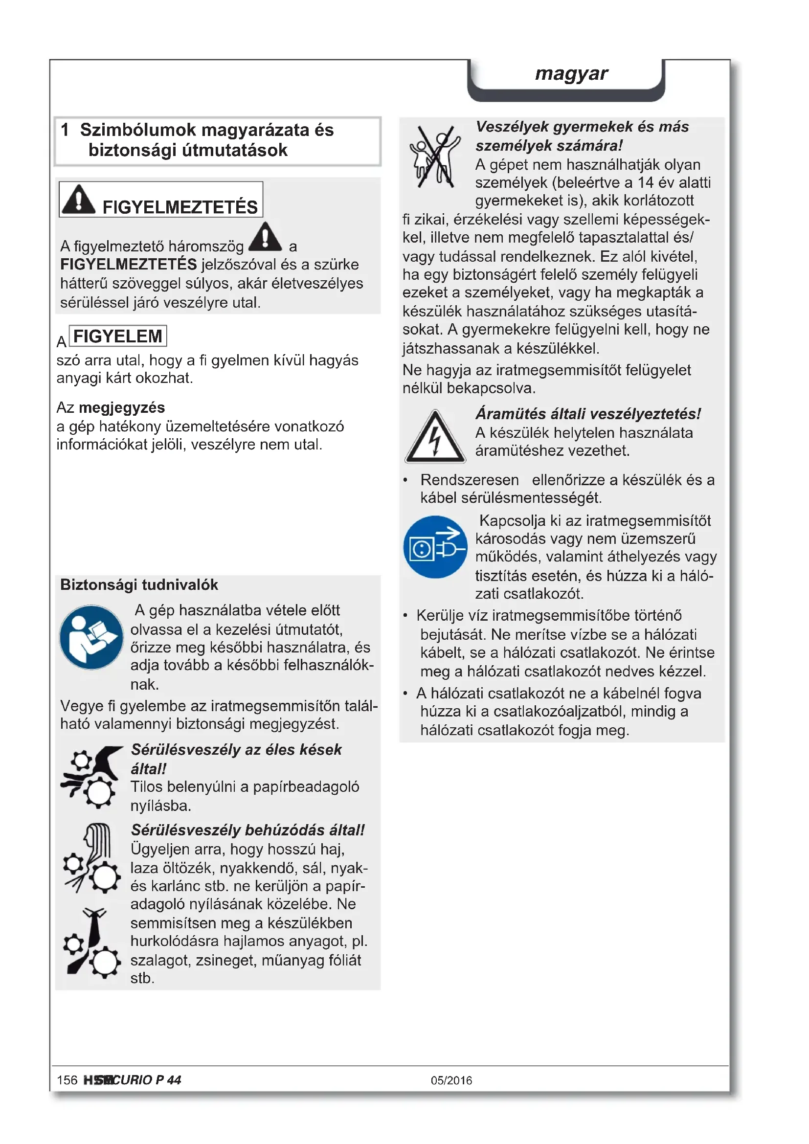 - Maks. število listov (DIN A4, 70 g/m² oz. 80 g/m²), dodanih vzdolžno, ki se razrežejo v enem prehodu. Ugotavljanje navedenih podatkov o kapaciteti poteka z novim naoljenim rezilom in hladnim motorjem. Šibkejša omrežna napetost ali druga omrežna frekvenca, kot je navedeno, lahko povzroči manjšo kapaciteto in povečan hrup pri delovanju. Glede na strukturo in lastnosti papirja in na način dodajanja lahko kapaciteta odstopa.156 SECURIO P 44 05/2016 magyar 1 Szimbólumok magyarázata és biztonsági útmutatások Az megjegyzés a gép hatékony üzemeltetésére vonatkozó információkat jelöli, veszélyre nem utal. FIGYELMEZTETÉS A fi gyelmeztető háromszög a FIGYELMEZTETÉS jelzőszóval és a szürke hátterű szöveggel súlyos, akár életveszélyes sérüléssel járó veszélyre utal. Biztonsági tudnivalók A gép használatba vétele előtt olvassa el a kezelési útmutatót, őrizze meg későbbi használatra, és adja tovább a későbbi felhasználók- nak. Vegye fi gyelembe az iratmegsemmisítőn talál- ható valamennyi biztonsági megjegyzést. Sérülésveszély az éles kések által! Tilos belenyúlni a papírbeadagoló nyílásba. Sérülésveszély behúzódás által! Ügyeljen arra, hogy hosszú haj, laza öltözék, nyakkendő, sál, nyak- és karlánc stb. ne kerüljön a papír- adagoló nyílásának közelébe. Ne semmisítsen meg a készülékben hurkolódásra hajlamos anyagot, pl. szalagot, zsineget, műanyag fóliát stb. Veszélyek gyermekek és más személyek számára! A gépet nem használhatják olyan személyek (beleértve a 14 év alatti gyermekeket is), akik korlátozott fi zikai, érzékelési vagy szellemi képességek- kel, illetve nem megfelelő tapasztalattal és/ vagy tudással rendelkeznek. Ez alól kivétel, ha egy biztonságért felelő személy felügyeli ezeket a személyeket, vagy ha megkapták a készülék használatához szükséges utasítá- sokat. A gyermekekre felügyelni kell, hogy ne játszhassanak a készülékkel. Ne hagyja az iratmegsemmisítőt felügyelet nélkül bekapcsolva. Áramütés általi veszélyeztetés! A készülék helytelen használata áramütéshez vezethet.