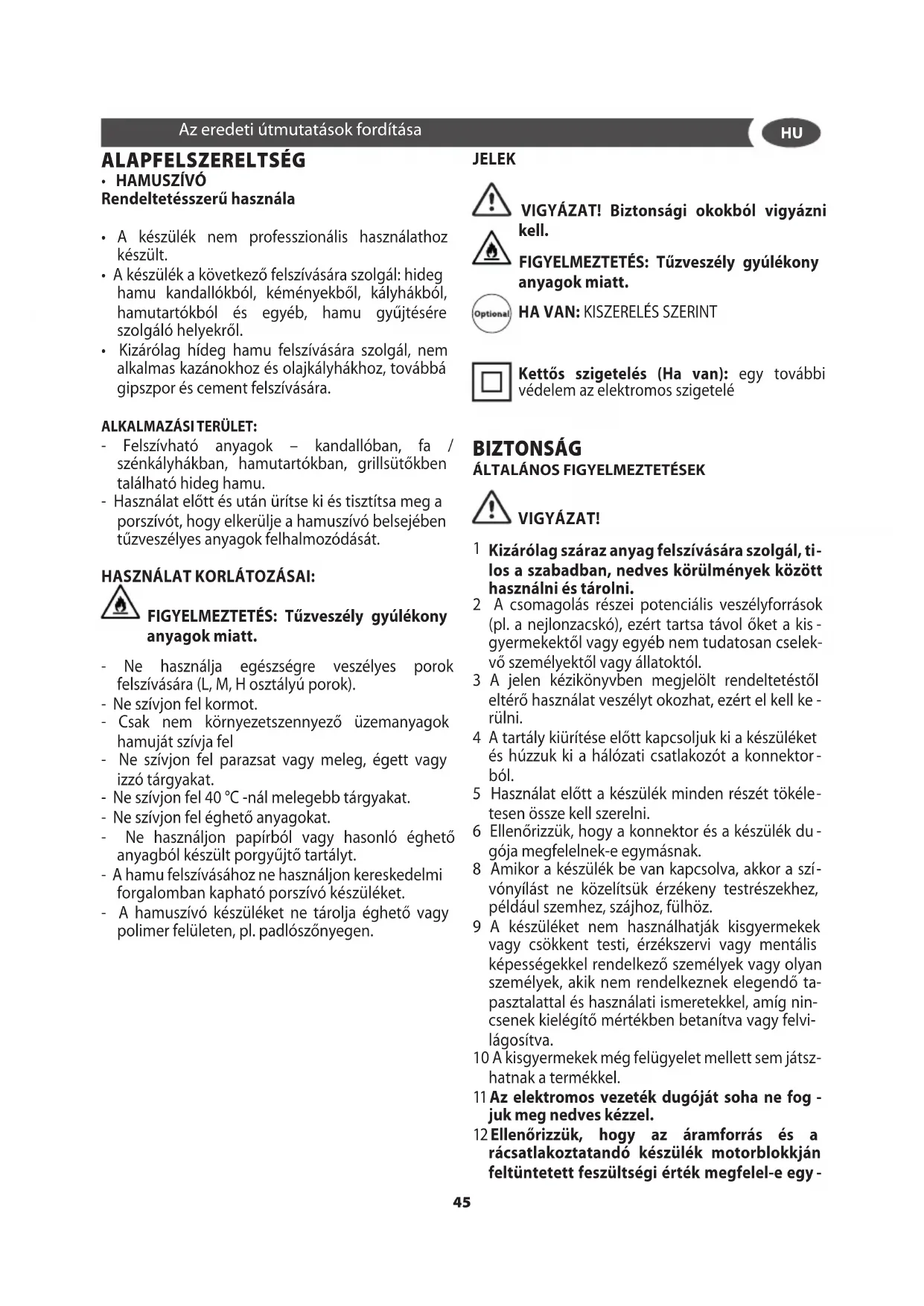 - Kizárólag hídeg hamu felszívására szolgál, nem alkalmas kazánokhoz és olajkályhákhoz, továbbá gipszpor és cement felszívására. ALKALMAZÁSI TERÜLET: - Felszívható anyagok – kandallóban, fa / szénkályhákban, hamutartókban, grillsütőkben található hideg hamu. - Használat előtt és után ürítse ki és tisztítsa meg a porszívót, hogy elkerülje a hamuszívó belsejében tűzveszélyes anyagok felhalmozódását. HASZNÁLAT KORLÁTOZÁSAI: FIGYELMEZTETÉS: Tűzveszély gyúlékony anyagok miatt. - Ne használja egészségre veszélyes porok felszívására (L, M, H osztályú porok). - Ne szívjon fel kormot. - Csak nem környezetszennyező üzemanyagok hamuját szívja fel - Ne szívjon fel parazsat vagy meleg, égett vagy izzó tárgyakat. - Ne szívjon fel 40 °C -nál melegebb tárgyakat. - Ne szívjon fel éghető anyagokat. - Ne használjon papírból vagy hasonló éghető anyagból készült porgyűjtő tartályt. - A hamu felszívásához ne használjon kereskedelmi forgalomban kapható porszívó készüléket. - A hamuszívó készüléket ne tárolja éghető vagy polimer felületen, pl. padlószőnyegen. Az eredeti útmutatások fordítása