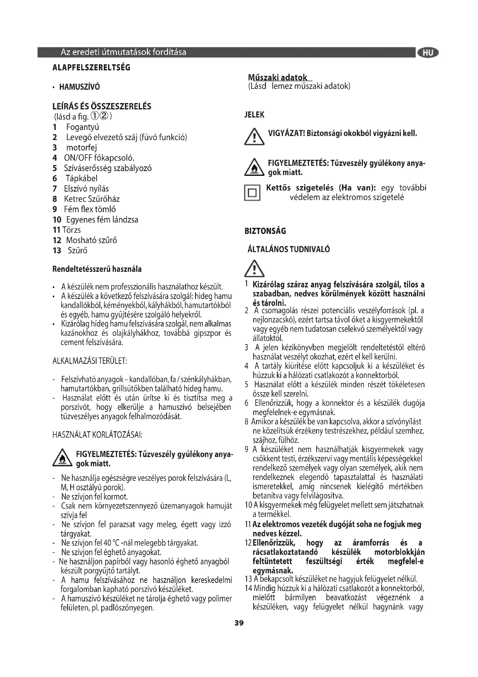 - Kizárólag hídeg hamu felszívására szolgál, nem alkalmas kazánokhoz és olajkályhákhoz, továbbá gipszpor és cement felszívására. ALKALMAZÁSI TERÜLET: - Felszívható anyagok – kandallóban, fa / szénkályhákban, hamutartókban, grillsütőkben található hideg hamu. - Használat előtt és után ürítse ki és tisztítsa meg a porszívót, hogy elkerülje a hamuszívó belsejében tűzveszélyes anyagok felhalmozódását. HASZNÁLAT KORLÁTOZÁSAI: FIGYELMEZTETÉS: Tűzveszély gyúlékony anya- gok miatt. - Ne használja egészségre veszélyes porok felszívására (L, M, H osztályú porok). - Ne szívjon fel kormot. - Csak nem környezetszennyező üzemanyagok hamuját szívja fel - Ne szívjon fel parazsat vagy meleg, égett vagy izzó tárgyakat. - Ne szívjon fel 40 °C -nál melegebb tárgyakat. - Ne szívjon fel éghető anyagokat. - Ne használjon papírból vagy hasonló éghető anyagból készült porgyűjtő tartályt. - A hamu felszívásához ne használjon kereskedelmi forgalomban kapható porszívó készüléket. - A hamuszívó készüléket ne tárolja éghető vagy polimer felületen, pl. padlószőnyegen. Az eredeti útmutatások fordítása 39eller: - Fjern buret (8), skub lteret (12) helt hjem g.