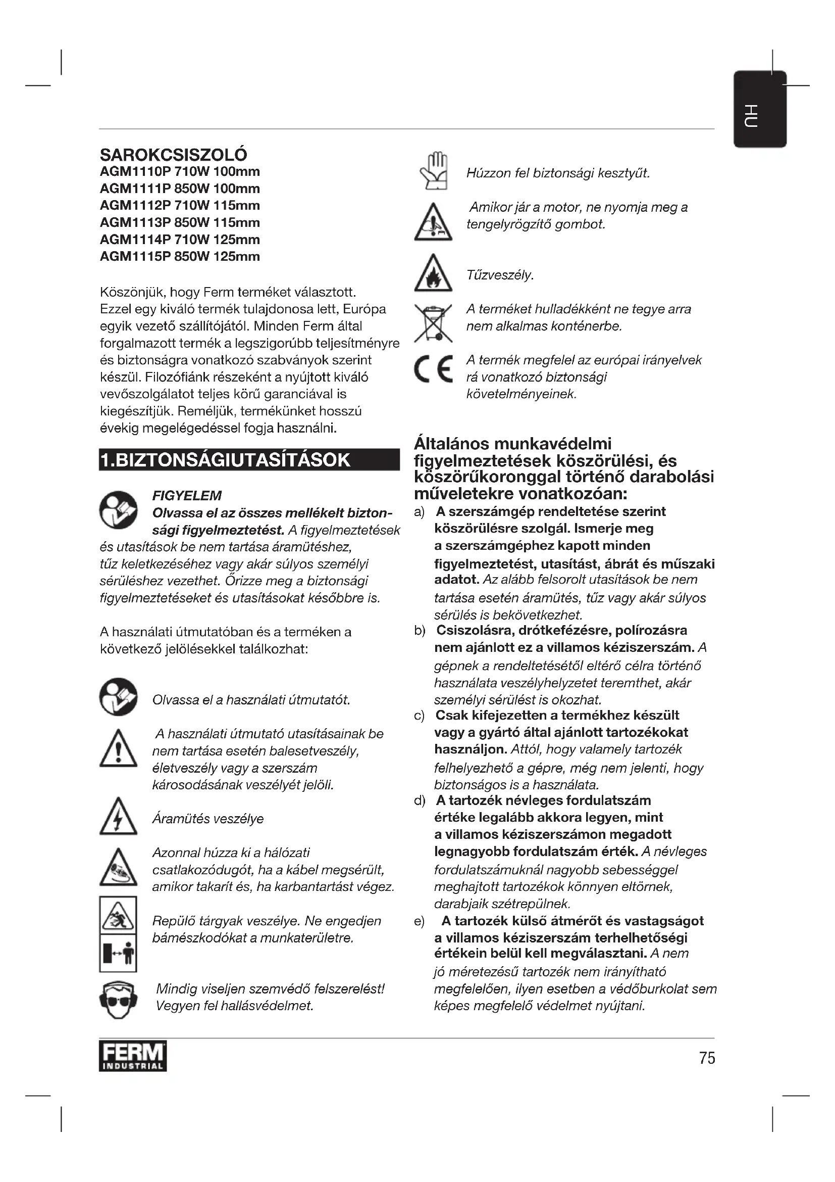 SAROKCSISZOLÓ AGM1110P 710W 100mm AGM1111P 850W 100mm AGM1112P 710W 115mm AGM1113P 850W 115mm AGM1114P 710W 125mm AGM1115P 850W 125mm Köszönjük, hogy Ferm terméket választott. Ezzel egy kiváló termék tulajdonosa lett, Európa egyik vezető szállítójától. Minden Ferm által forgalmazott termék a legszigorúbb teljesítményre és biztonságra vonatkozó szabványok szerint készül. Filozófiánk részeként a nyújtott kiváló vevőszolgálatot teljes körű garanciával is kiegészítjük. Reméljük, termékünket hosszú évekig megelégedéssel fogja használni.