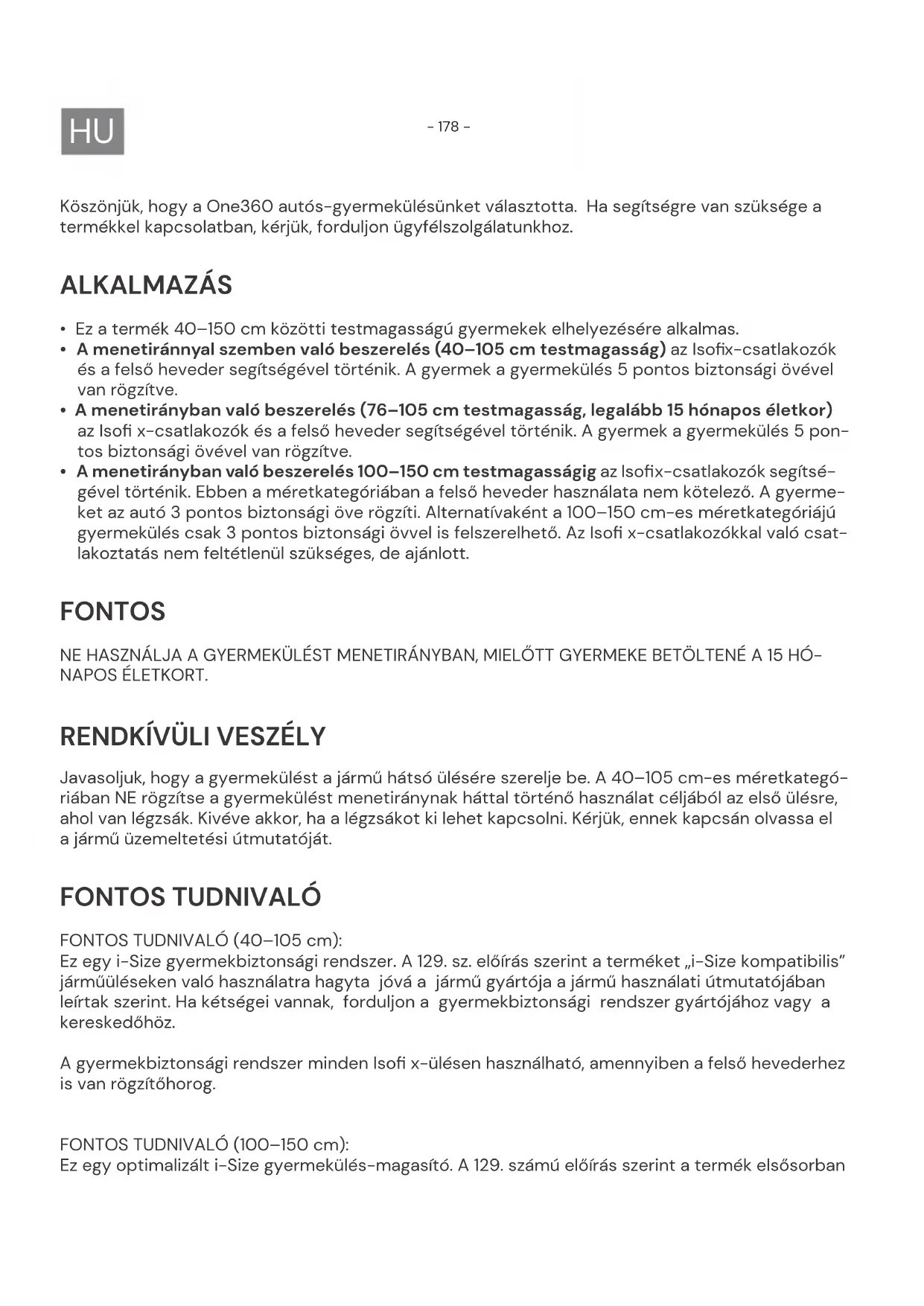 Javasoljuk, hogy a gyermekülést a jármű hátsó ülésére szerelje be. A 40–105 cm-es méretkategó- riában NE rögzítse a gyermekülést menetiránynak háttal történő használat céljából az első ülésre, ahol van légzsák. Kivéve akkor, ha a légzsákot ki lehet kapcsolni. Kérjük, ennek kapcsán olvassa el a jármű üzemeltetési útmutatóját. FONTOS TUDNIVALÓ FONTOS TUDNIVALÓ (40–105 cm): Ez egy i-Size gyermekbiztonsági rendszer. A 129. sz. előírás szerint a terméket „i-Size kompatibilis” járműüléseken való használatra hagyta jóvá a jármű gyártója a jármű használati útmutatójában leírtak szerint. Ha kétségei vannak, forduljon a gyermekbiztonsági rendszer gyártójához vagy a kereskedőhöz. A gyermekbiztonsági rendszer minden Isofi x-ülésen használható, amennyiben a felső hevederhez is van rögzítőhorog. FONTOS TUDNIVALÓ (100–150cm): Ez egy optimalizált i-Size gyermekülés-magasító. A 129. számú előírás szerint a termék elsősorban- 179 -