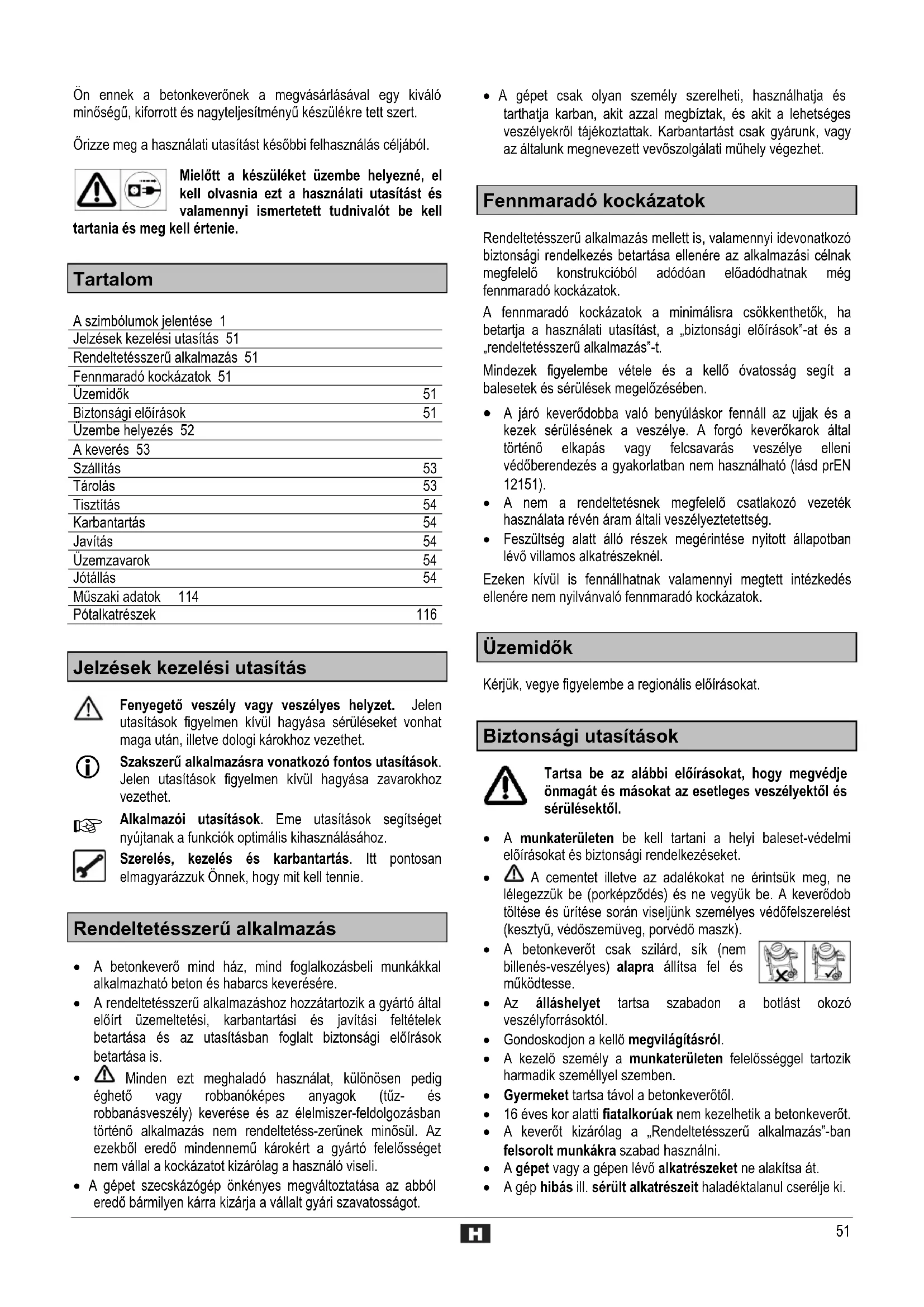 Eredeti használati utasítás a betonkeverők (1 – 7. oldal, 51 – 54 és 113 – 117)