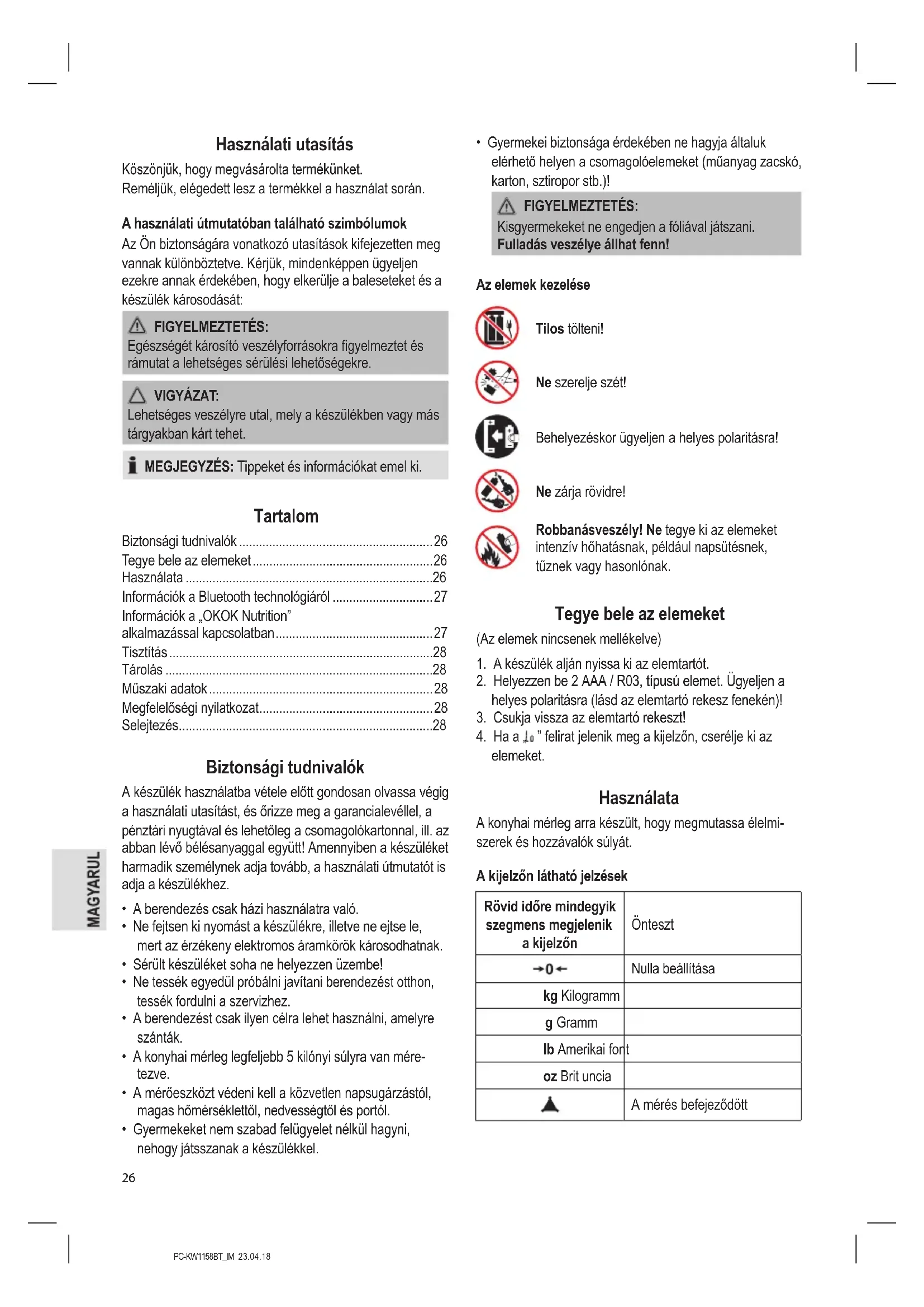 - A kikapcsolási automatika révén a mérleg kb. 60 mp után magától kikapcsol. Ha korábban szeretné kikapcsolni a mérleget, kb. 2 másod- percig tartsa benyomva az / TARE gombot. Használaton kívüli időszak Ha a készüléket hosszabb ideig nem használja, vegye ki az elemeket, nehogy az elemek megfolyjanak. Információk a Bluetooth technológiáról A Bluetooth egy olyan technológia, amely lehetővé teszi a készülékek vezeték nélküli kapcsolatát rövid távolságban. A Bluetooth szabvánnyal rendelkező készülékek ISM sávon (Industrial, Scientic and Medical), 2,402 és 2,480 GHz-en sugároznak. Interferenciát okozhatnak pl. WLAN hálózatok, DAB rádiók, vezeték nélküli telefonok vagy mikrohullámú sütők, amelyek ugyanazon frekvenciatartományban működnek. Ezek a mérlegek felkínálják a kiszámított adatok elkül- désének lehetőségét Bluetooth funkción keresztül az okostelefonjára vagy a táblagépére. További információt a következő részben találhat: (Információk a „OKOK Nutrition” alkalmazással kapcsolatban). A sok különböző készülékgyártó, típus és szoftververzió miatt a teljes funkcionalitás nem garantálható. Információk a „OKOK Nutrition” alkalmazással kapcsolatban A készülék csatlakoztatható az „OKOK Nutrition” alkalma- záshoz. Ez az alkalmazás az élelmiszerek összetételét elemzi. Ide tartoznak: Kalória, zsír, fehérje, szénhidrát, rostok, koleszterin, kalcium és vas. MEGJEGYZÉS: