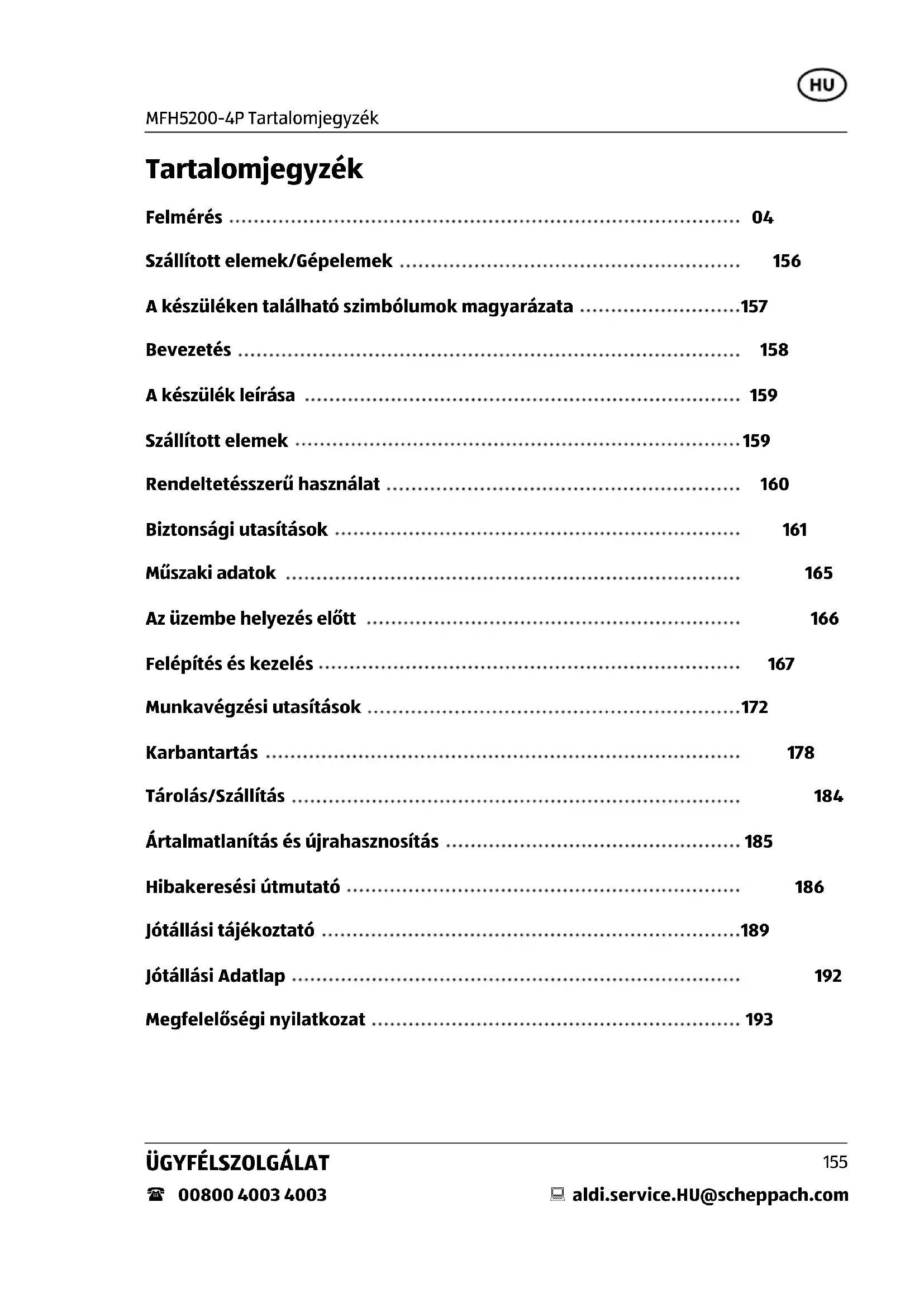 00800 4003 4003 aldi.service.HU@scheppach.com MFH5200-4P Tartalomjegyzék Tartalomjegyzék Felmérés 04 Szállított elemek/Gépelemek 156 A készüléken található szimbólumok magyarázata 157 Bevezetés 158 A készülék leírása 159 Szállított elemek 159 Rendeltetésszerű használat 160 Biztonsági utasítások 161 Műszaki adatok 165 Az üzembe helyezés előtt 166 Felépítés és kezelés 167 Munkavégzési utasítások 172 Karbantartás 178 Tárolás/Szállítás 184 Ártalmatlanítás és újrahasznosítás 185 Hibakeresési útmutató 186 Jótállási tájékoztató 189 Jótállási Adatlap 192 Megfelelőségi nyilatkozat 193156