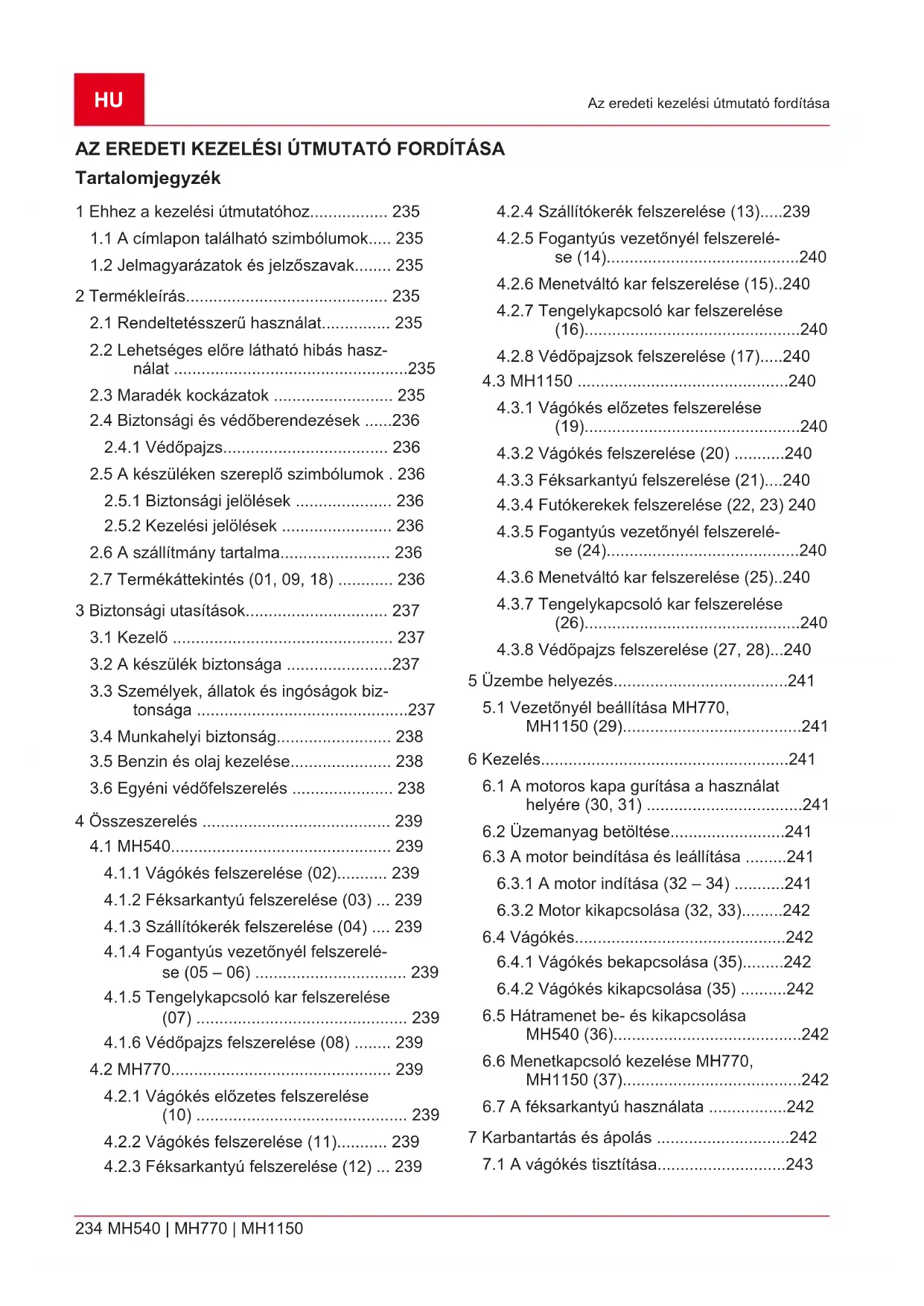 TUDNIVALÓ Olyan hibák esetében, ame- lyek nem szerepelnek ebben a táblázatban, vagy amelyeket saját maga nem tudja kijavítani ve- vőszolgálatunkhoz. Zavar Ok Elhárítás A motor teljesítménye csökken. A légszűrő eltömődött Levegőszűrő ellenőrzése és tisztítása Üzemanyag-égetési problé- mák Forduljon szervizhez A vágókés szennyezett Tisztítsa meg a vágókést Motor nem indul el. Nincs üzemanyag Töltsön be üzemanyagot Rossz, szennyezett üzem- anyag, régi üzemanyag a tar- tályban Ürítse ki a tartályt és öntsön be friss üzemanyagot Hibás indítási folyamat Hajtsa végre helyesen az indítást Gázkar rossz pozícióban A gázkart állítsa „START” helyzetbe Hiba a gyújtógyertyánál Lásd a motor útmutatóját. Légszűrő Lásd a motor útmutatóját. Vágókés nem forog Az ékszíj hibás Forduljon szervizhez Hajtómű károsodása Forduljon szervizhezHU 244 MH540 | MH770 | MH1150 Szállítás Zavar Ok Elhárítás Laza vágókés Húzza meg a vágókést A bowdenhuzal megnyúlt vagy laza Állítsa be a bowdenhuzalt