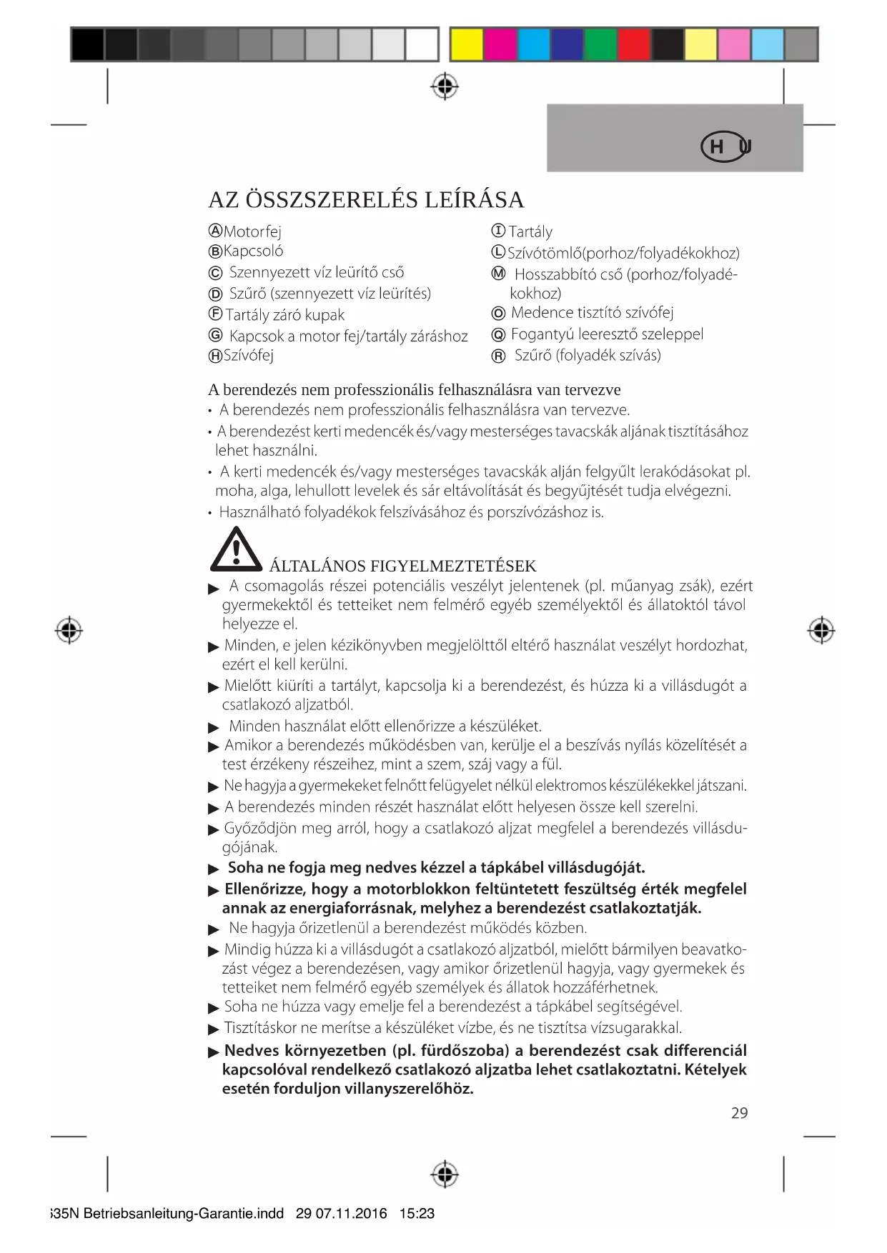 A berendezest nem szabad kerti medencek es/vagy mesterseges tavacskak, kadak, mosdokagylok stb. kiuritesehez hasznalni.