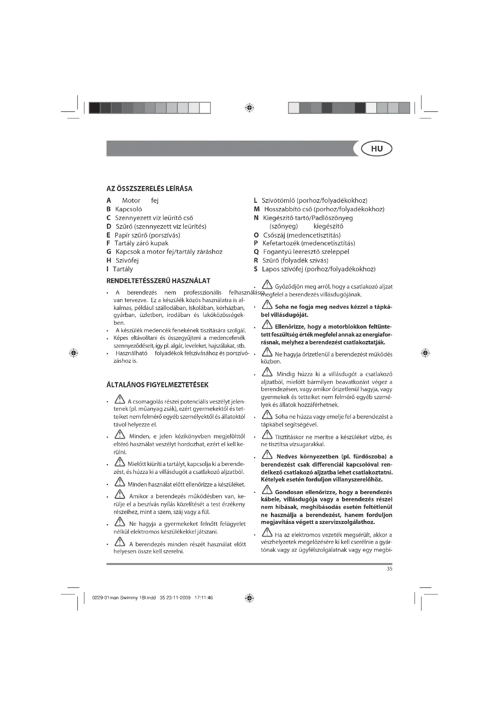Ha az elektromos vezeték megsérült, akkor a vészhelyzetek megelőzésére ki kell cserélnie a gyár- tónak vagy az ügyfélszolgálatnak vagy egy megbí- 0229-01man Swimmy 18l.indd 35 23-11-2009 17:11:46EN