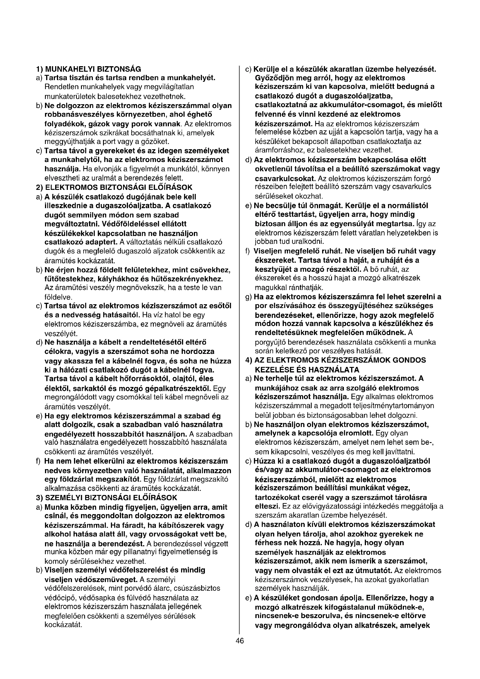 FIGYELEM! Olvassa el az összes biztonsági figyelmeztetéstéselőírást. A következőkben leírt előírások betartásának elmulasztása áramütésekhez, tűzhöz és/vagy súlyos testi sérülésekhez vezethet. Kérjük a későbbihasználatragondosanőrizzemegezeketaz előírásokat. Az alább alkalmazott elektromos kéziszerszám fogalom a hálózati elektromos kéziszerszámokat (hálózati csatlakozó kábellel) és az akkumulátoros elektromos kéziszerszámokat (hálózati csatlakozó kábel nélkül) foglalja magában.46