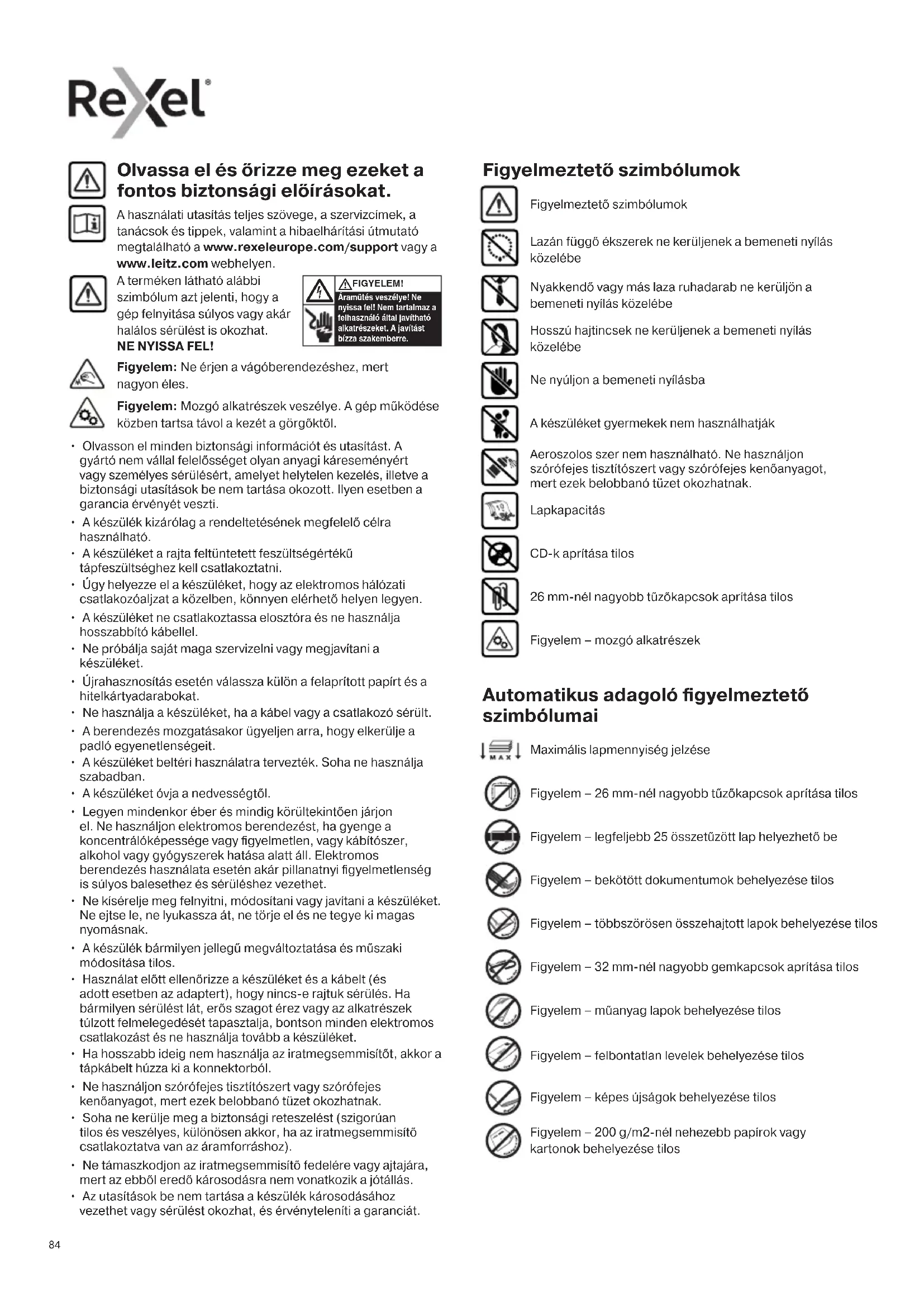 - Az utasítások be nem tartása a készülék károsodásához vezethet vagy sérülést okozhat, és érvényteleníti a garanciát. Olvassa el és őrizze meg ezeket a fontos biztonsági előírásokat. A használati utasítás teljes szövege, a szervizcímek, a tanácsok és tippek, valamint a hibaelhárítási útmutató megtalálható a www.rexeleurope.com/support vagy a www.leitz.com webhelyen. Lazán függő ékszerek ne kerüljenek a bemeneti nyílás közelébe Nyakkendő vagy más laza ruhadarab ne kerüljön a bemeneti nyílás közelébe Figyelmeztető szimbólumok Hosszú hajtincsek ne kerüljenek a bemeneti nyílás közelébe Ne nyúljon a bemeneti nyílásba Figyelmeztető szimbólumok Lapkapacitás CD-k aprítása tilos 26 mm-nél nagyobb tűzőkapcsok aprítása tilos Figyelem – mozgó alkatrészek Figyelem: Ne érjen a vágóberendezéshez, mert nagyon éles. Figyelem: Mozgó alkatrészek veszélye. A gép működése közben tartsa távol a kezét a görgőktől. A készüléket gyermekek nem használhatják Aeroszolos szer nem használható. Ne használjon szórófejes tisztítószert vagy szórófejes kenőanyagot, mert ezek belobbanó tüzet okozhatnak. Figyelem – 26 mm-nél nagyobb tűzőkapcsok aprítása tilos Figyelem – bekötött dokumentumok behelyezése tilos Figyelem – legfeljebb 25 összetűzött lap helyezhető be Automatikus adagoló figyelmeztető szimbólumai Figyelem – többszörösen összehajtott lapok behelyezése tilos Figyelem – 32 mm-nél nagyobb gemkapcsok aprítása tilos Maximális lapmennyiség jelzése Figyelem – képes újságok behelyezése tilos Figyelem – 200 g/m2-nél nehezebb papírok vagy kartonok behelyezése tilos Figyelem – műanyag lapok behelyezése tilos Figyelem – felbontatlan levelek behelyezése tilos858585 Ikon Típus Modellek Gomb/jelzőlámpa és működés Auto-start és készenléti gomb (egyszeri megnyomás) Kézi visszamenet gomb (lenyomva tartva) Kézi előremenet gomb (lenyomva tartva) Használatra kész állapot jelzőlámpa Túlmelegedés jelzőlámpa (hagyja lehűlni az iratmegsemmisítőt) Túlterhelés jelzőlámpa / Elakadásjelző (csökkentse a lapok számát / szüntesse meg az elakadást) Tartály tele jelzőlámpa (nyissa ki az ajtót és ürítse ki a tartályt; 45X – emelje le az aprítófej egységet és ürítse ki a tartályt) Ajtó nyitva vagy az iratmegsemmisítő aprítófeje eltávolítva jelzőlámpa (szorosan zárja be az ajtót vagy helyezze vissza az aprítófejet) Adagolófedél zárva jelzőlámpa (feloldható a négyjegyű kombináció megadásával) Adagolófedél kombinációs zárának 1. gombja Adagolófedél kombinációs zárának 2. gombja Adagolófedél kombinációs zárának 3. gombja Adagolófedél kombinációs zárának 4. gombja Üzemeltetés
