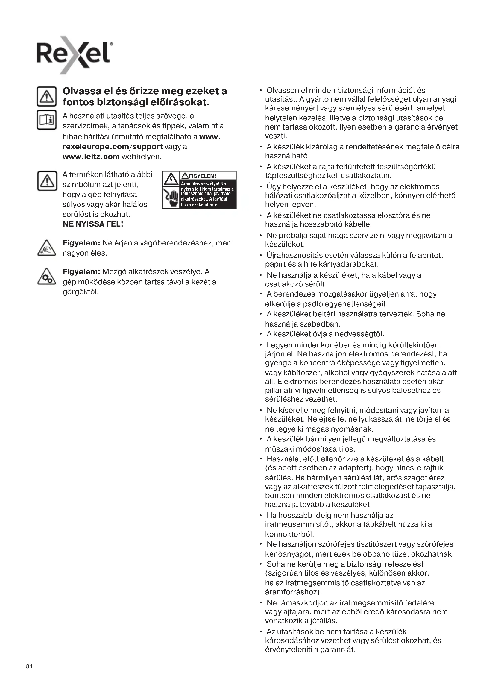 - Az utasítások be nem tartása a készülék károsodásához vezethet vagy sérülést okozhat, és érvényteleníti a garanciát. Olvassa el és őrizze meg ezeket a fontos biztonsági előírásokat. A használati utasítás teljes szövege, a szervizcímek, a tanácsok és tippek, valamint a hibaelhárítási útmutató megtalálható a www. rexeleurope.com/support vagy a www.leitz.com webhelyen. Figyelem: Ne érjen a vágóberendezéshez, mert nagyon éles. Figyelem: Mozgó alkatrészek veszélye. A gép működése közben tartsa távol a kezét a görgőktől.858585 Lazán függő ékszerek ne kerüljenek a bemeneti nyílás közelébe Nyakkendő vagy más laza ruhadarab ne kerüljön a bemeneti nyílás közelébe Figyelmeztető szimbólumok Hosszú hajtincsek ne kerüljenek a bemeneti nyílás közelébe Ne nyúljon a bemeneti nyílásba Figyelmeztető szimbólumok Lapkapacitás CD-k aprítása tilos 26 mm-nél nagyobb tűzőkapcsok aprítása tilos Figyelem – mozgó alkatrészek A készüléket gyermekek nem használhatják Aeroszolos szer nem használható. Ne használjon szórófejes tisztítószert vagy szórófejes kenőanyagot, mert ezek belobbanó tüzet okozhatnak. Ikon Típus Csúszókapcsoló / jelzőlámpa és művelet Vezérlőgombok Auto-start és készenléti gomb (egyszeri megnyomás) Kézi visszamenet gomb (lenyomva tartva) Kézi előremenet gomb (lenyomva tartva) Túlmelegedés jelzőlámpa (hagyja lehűlni az iratmegsemmisítőt) Túlterhelés jelzőlámpa / Elakadásjelző (csökkentse a lapok számát / szüntesse meg az elakadást) Nyomógombos modellek Ikon Típus Csúszókapcsoló / jelzőlámpa és művelet Csúszókapcsoló Auto-start (csúsztassa ide az aprításhoz) Visszamenet (csúsztassa ide) Előremenet (csúsztassa ide) Állapotjelző lámpák Kikapcsolás (csúsztassa ide) Használatra kész állapot jelzőlámpa (az aprítófej legyen a tartályon és a csúszókapcsoló legyen az Auto-start állásban) Túlmelegedés jelzőlámpa (hagyja lehűlni az iratmegsemmisítőt) Vezérlők és jelzőlámpák Csúszókapcsolós modellek Hitelkártyák aprítása tilos Tartozékok Kizárólag eredeti Rexel tartozékokat használjon: Olajozólapok (20) - 2101949 Olajozólapok (12) - 210194886 Vastag papír vagy karton, < 200 g/m². Több összehajtott lap (A3 lapok félbehajtva). Fényes papír vagy mindkét oldalán nyomtatott lap. CD-k és DVD-k Aeroszolos szer nem használható. Nincs olaj, csak olajlemezek Aprítási kapacitás Az alábbiak aprítására alkalmas: