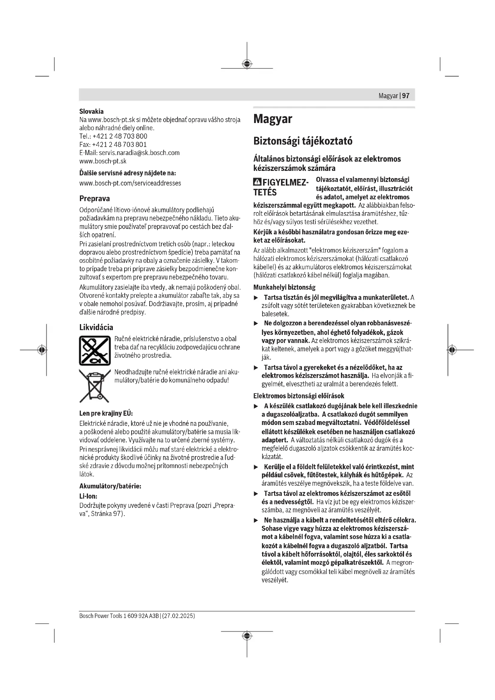 Az ezen utasításokban megadott rezgésszint és zajkibocsátá- si érték egy szabványban rögzített mérési módszerrel került meghatározásra és az elektromos kéziszerszámok egymással való összehasonlítására alkalmazható. Ez az érték a rezgés- és zajkibocsátás ideiglenes becslésére is alkalmas. A megadott rezgésszint és zajkibocsátási érték az elektro- mos kéziszerszám fő alkalmazásaira vonatkozik. Ha az elekt- romos kéziszerszámot más alkalmazásokra, eltérő betétszer- számokkal vagy nem kielégítő karbantartás mellett használ- ják, a rezgésszint és a zajkibocsátási érték a fenti értékektől eltérhet. Ez az egész munkaidőre vonatkozó rezgés- és zajki- bocsátást lényegesen megnövelheti. A rezgés- és zajkibocsátás pontos megbecsüléséhez figye- lembe kell venni azokat az időszakokat is, amikor a készülék kikapcsolt állapotban van, vagy amikor be van ugyan kap- csolva, de nem kerül ténylegesen használatra. Ez az egész munkaidőre vonatkozó rezgés- és zajkibocsátást lényegesen csökkentheti. Hozzon kiegészítő biztonsági intézkedéseket a kezelőnek a rezgések hatása elleni védelmére, például: Az elektromos ké- ziszerszám és a betétszerszámok karbantartása, a kezek me- legen tartása, a munkamenetek megszervezése. Összeszerelés u Minden elektromos kéziszerszámon végzett munka előtt (pl. karbantartás, szerszámcsere stb.) vegye ki az akkumulátort az elektromos kéziszerszámból. Ellen- kező esetben a be‑/kikapcsoló véletlen megérintésekor bekapcsolódó készülék sérüléseket okozhat. Az akkumulátor feltöltése u Csak a Műszaki Adatoknál megadott töltőkészüléke- ket használja. Csak ezek a töltőkészülékek felelnek meg pontosan az Ön elektromos kéziszerszámában alkalma- zásra kerülő Li‑ion-akkumulátornak. Figyelem: Az akkumulátor részben feltöltve kerül kiszállítás- ra. Az akkumulátor teljes teljesítményének biztosítására az első alkalmazás előtt töltse fel teljesen az akkumulátort a töl- tőkészülékben. A Li‑ion-akkumulátort bármikor fel lehet tölteni, anélkül, hogy ez megrövidítené az élettartamát. A töltési folyamat megszakítása nem árt az akkumulátornak. A lithium-ionos-akkumulátort az „Electronic Cell Protection (ECP)“ védi a túl erős kisülés ellen. Ha az akkumulátor kime- rült, az elektromos kéziszerszámot egy védőkapcsoló kikap- csolja: Ekkor a betétszerszám nem mozog tovább. u Az elektromos kéziszerszám automatikus kikapcsolá- sa után ne nyomja tovább a be‑/kikapcsolót. Ez meg- rongálhatja az akkumulátort. Vegye figyelembe a hulladékba való eltávolítással kapcsola- tos előírásokat. Az akkumulátor kivétele A (7) akkumulátor két reteszelővállal van ellátva, amelyek meggátolják, hogy az akkumulátor a (8) akkumulátor rete- szelés feloldó gomb akaratlan megnyomásakor kiessen. Amíg az akkumulátor be van helyezve az elektromos kézi- szerszámba, azt egy rugó a helyén tartja. 1 609 92A A3B | (27.02.2025) Bosch Power ToolsMagyar | 101 A (7) akkumulátor eltávolításához nyomja meg a (8) retesze- lés feloldó gombot és húzza ki az akkumulátort előrefelé az elektromos kéziszerszámból. Ne erőltesse a kihúzást. Akkumulátor töltöttségi szint kijelző Az akkumulátor töltési szint kijelző display zöld LED-jei az ak- kumulátor töltési szintjét mutatják. A töltöttségi szintet biz- tonsági okokból csak használaton kívüli elektromos kéziszer- szám esetén lehet lekérdezni. Nyomja meg a vagy a feltöltési szint kijelző gombot, hogy kijelezze a töltési szintet. Erre kivett akkumulátor ese- tén is van lehetőség. Ha az akkumulátor feltöltési szint kijelző gomb megnyomása után egy LED sem világít, az akkumulátor meghibásodott és ki kell cserélni. Akkumulátor típus: GBA 18V... LED-ek Kapacitás Tartós fény, 3× zöld 60−100% Tartós fény, 2× zöld 30−60% Tartós fény, 1× zöld 5−30% Villogó fény, 1× zöld 0−5% Akkumulátor típus: ProCORE18V... LED-ek Kapacitás Tartós fény, 5× zöld 80−100 % Tartós fény, 4× zöld 60−80 % Tartós fény, 3× zöld 40−60 % Tartós fény, 2× zöld 20−40 % Tartós fény, 1× zöld 5−20 % Villogó fény, 1× zöld 0−5 % Szerszámcsere (lásdaAábrát) u Minden elektromos kéziszerszámon végzett munka előtt (pl. karbantartás, szerszámcsere stb.) vegye ki az akkumulátort az elektromos kéziszerszámból. Ellen- kező esetben a be‑/kikapcsoló véletlen megérintésekor bekapcsolódó készülék sérüléseket okozhat. Húzza le a(4)mélységi ütközőt az elektromos kéziszerszám- ról. Húzza ki a(1)csavarbitet. Szükség esetén a(14)univerzális bittartót is ki lehet húzni és ki lehet cserél- ni. Szükség esetén használjon egy fogót. Szerszámcsere után ismét helyezze fel a(4)mélységi ütkö- zőt. Üzemeltetés Üzembe helyezés Az akkumulátor beszerelése Figyelem: Az elektromos kéziszerszámnak nem megfelelő akkumulátorok használata működési hibákhoz vagy az elekt- romos kéziszerszám megrongálódásához vezethet. Állítsa be a középső helyzetbe a (5) forgásirány-átkapcsolót, hogy meggátolja az akaratlan bekapcsolást. Tegye bele a fel- töltött (7) akkumulátort a fogantyúba, amíg az érezhetően beugrik a reteszelési helyzetbe és egy síkban fekszik a fogan- tyúval. A forgásirány beállítása (lásdE–Fábra) A (5) forgásirány-átkapcsoló az elektromos kéziszerszám forgásirányának megváltoztatására szolgál. Ha a (12) be-/ki- kapcsoló be van nyomva, akkor a forgásirányt nem lehet át- kapcsolni. Jobbra forgás: Tolja el az elektromos kéziszerszám bal olda- lán található(5)forgásirány-átkapcsolót az elektromos kézi- szerszám első oldala felé. Az elektromos kéziszerszám jobb oldalán a(5)forgásirány-átkapcsoló automatikusan hátrato- lódik. Balra forg