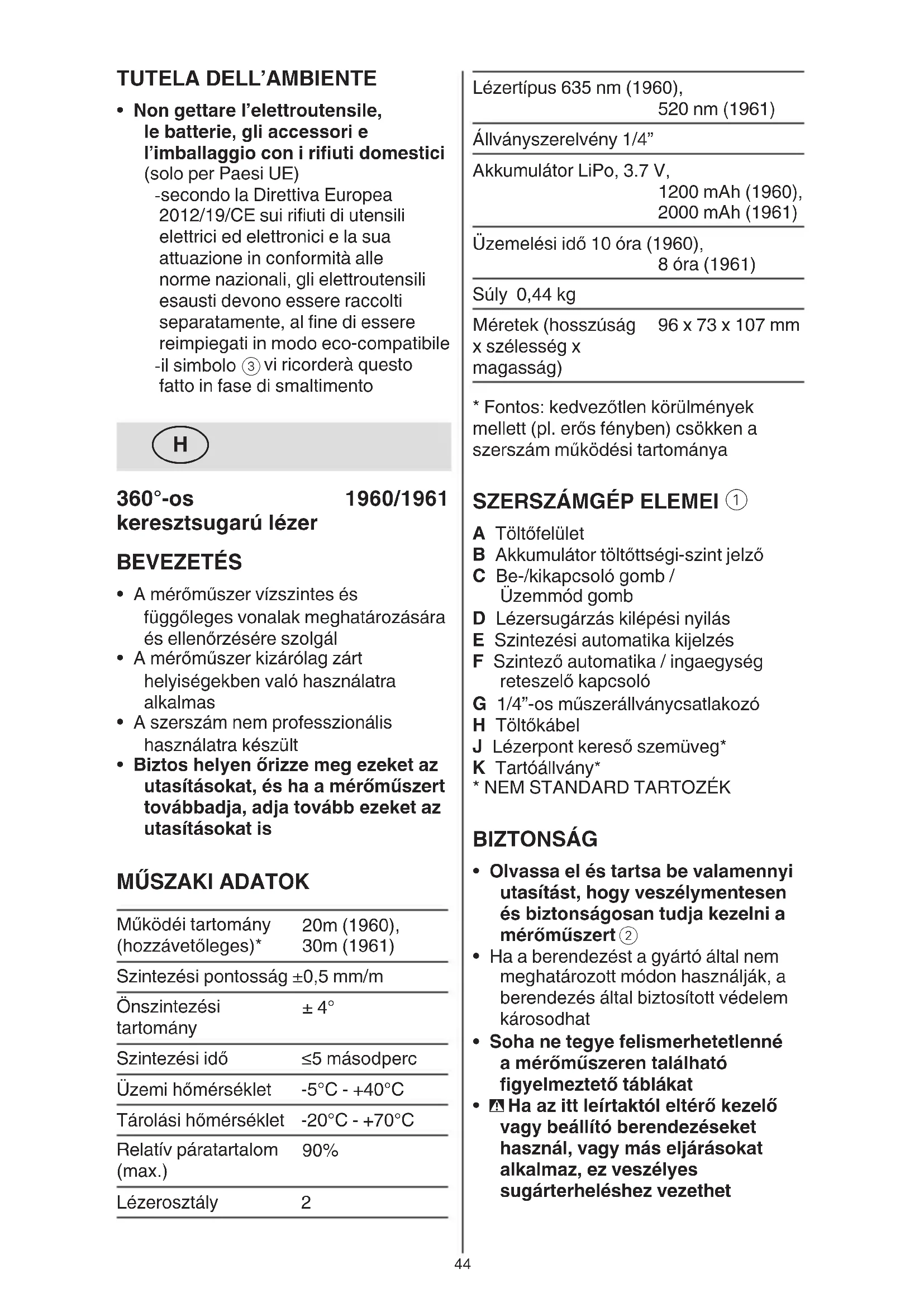 - Non esporre mai lo strumento di misura a temperature oppure44 Lézertípus 635 nm (1960), 520 nm (1961) Állványszerelvény 1/4” Akkumulátor LiPo, 3.7 V, 1200 mAh (1960), 2000 mAh (1961) Üzemelési idő 10 óra (1960), 8 óra (1961) Súly 0,44 kg Méretek (hosszúság x szélesség x magasság) 96 x 73 x 107 mm